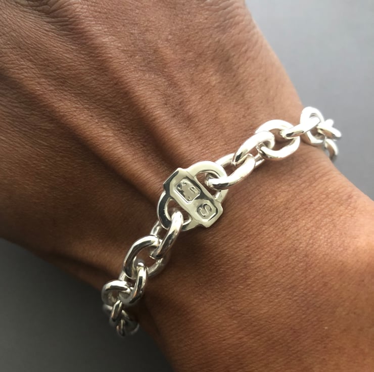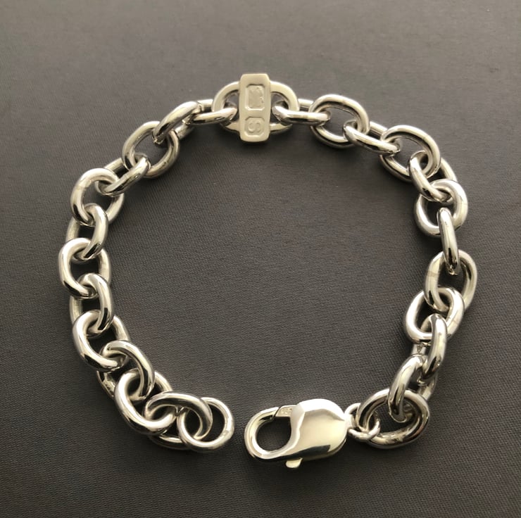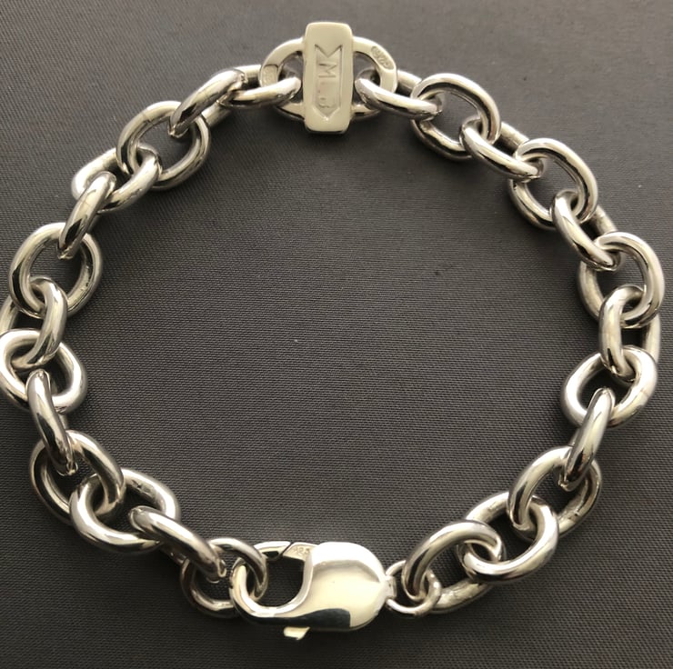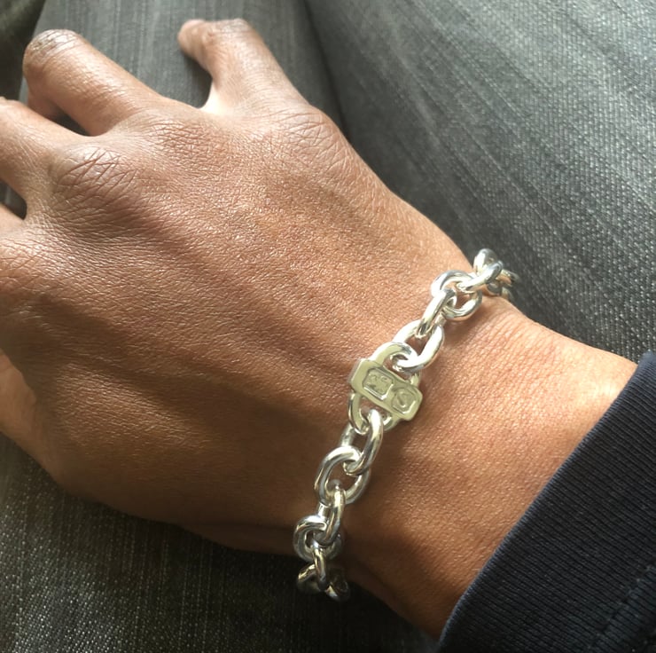 This is a men’s solid sterling silver bracelet and the weight of this bracelet is 40 grams, length of the bracelet is 8.5 inches long, can be made longer or shorter, looks nice on.