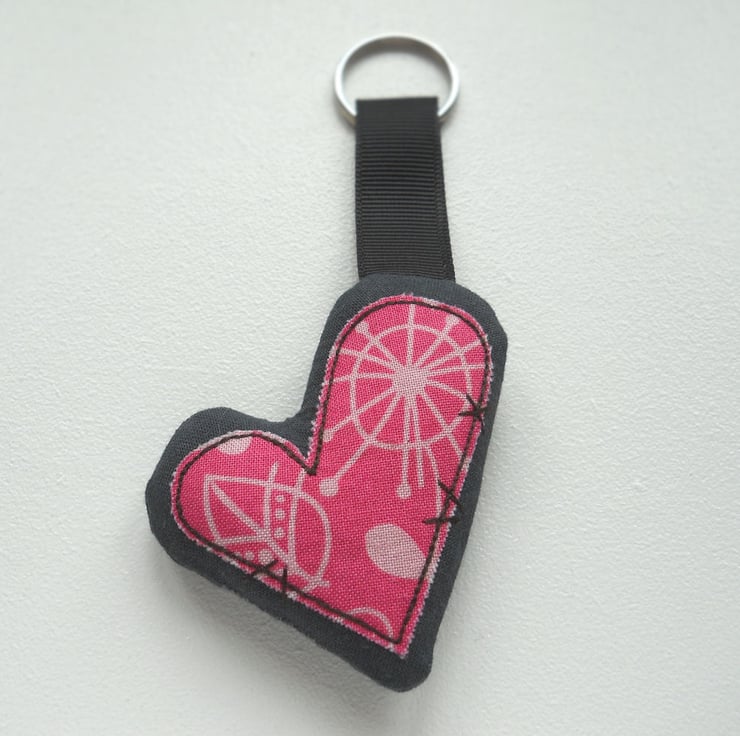 applique and free motion embroidered zombie heart keyring - pink cotton riley blake print, only 1 available - the heart in the photo is the one you will receive.