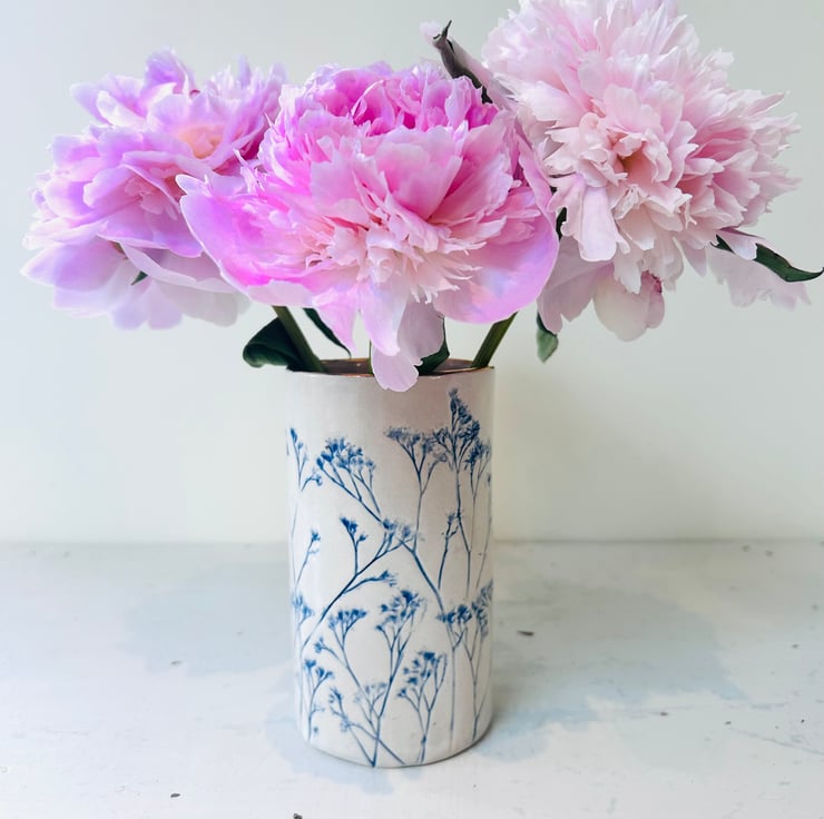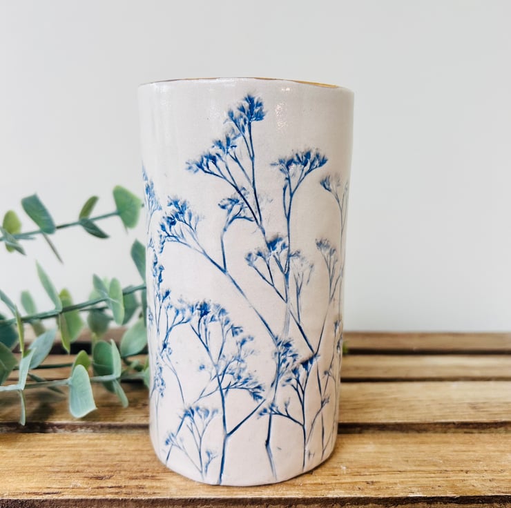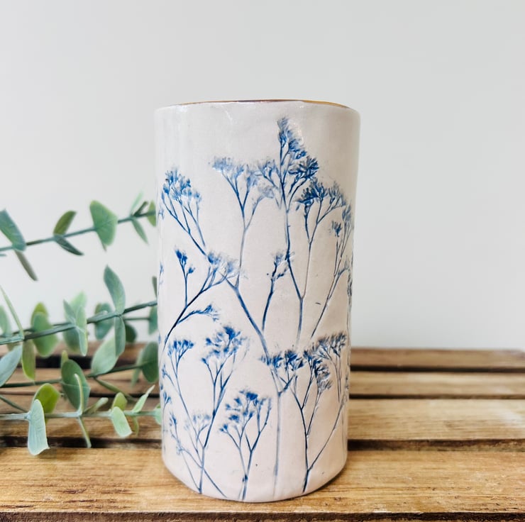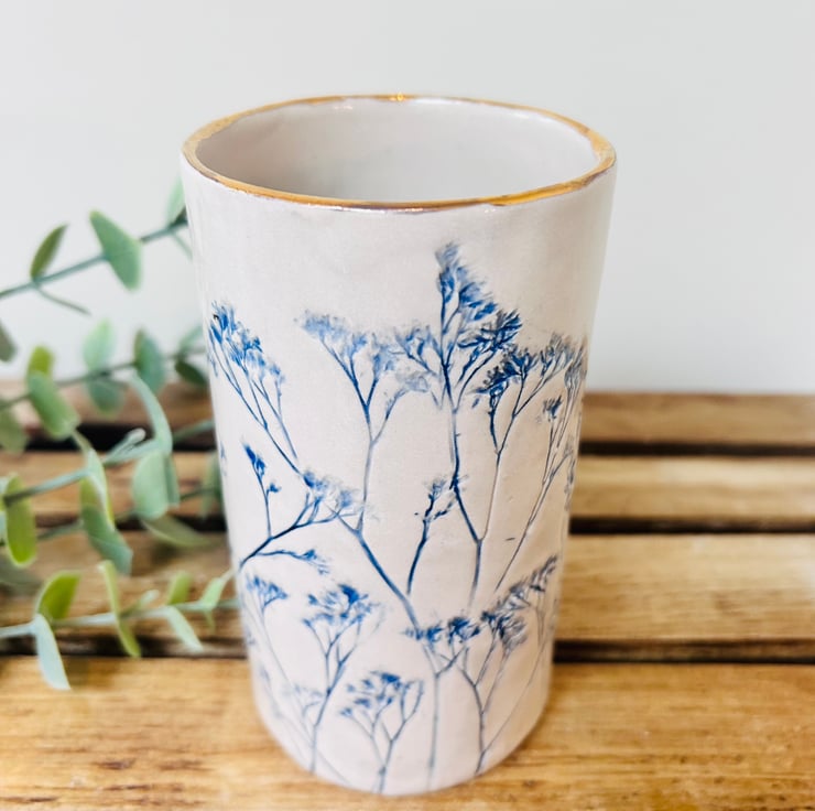 Each vase is pressed with real plants which leave the most beautiful impressions in the clay. They are all finished with gold lustre rim.