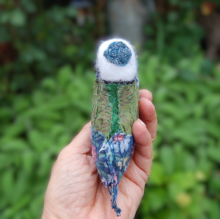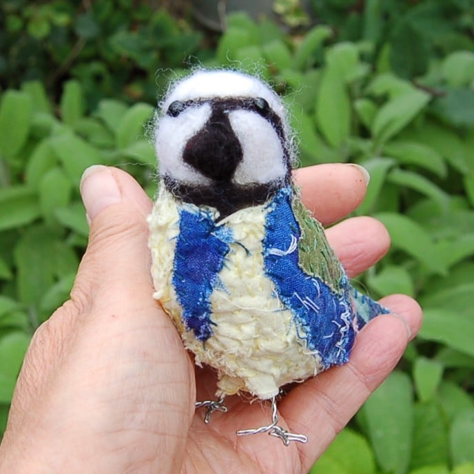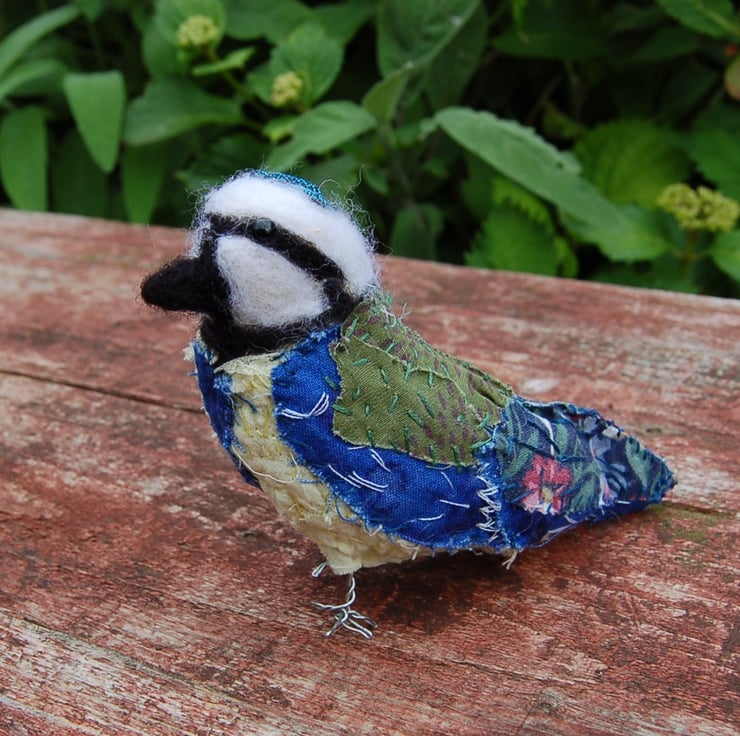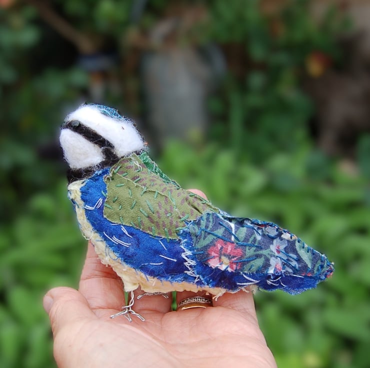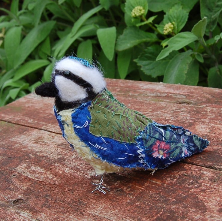 A cute one of a kind bluetit sculpture. Made from upcycled small pieces of fabric and hand stitched into this wonderful unique bluetit. The internal structure is wool. The legs are twisted wire.