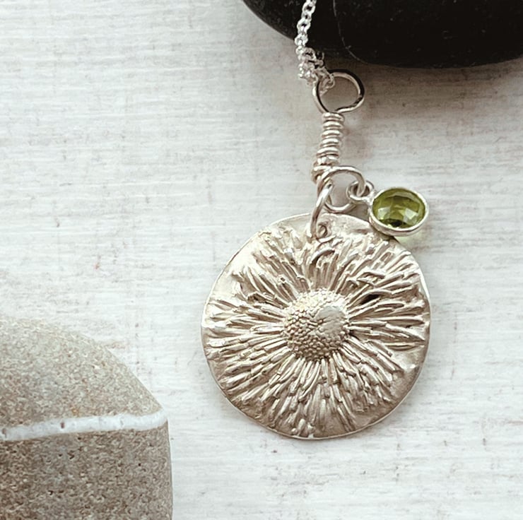 Beautiful dainty silver daisy pendant with semi precious peridot charm.