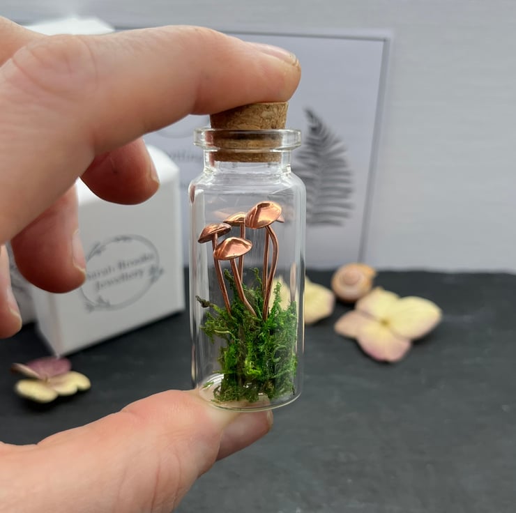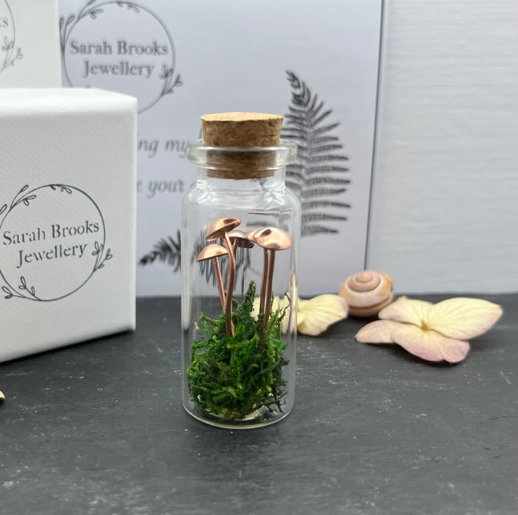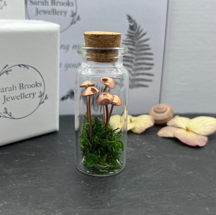 Handmade copper mushrooms/toadstools in a cute little glass bottle surrounded by moss.