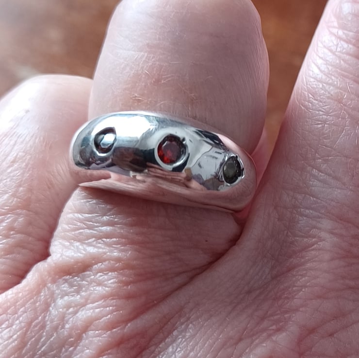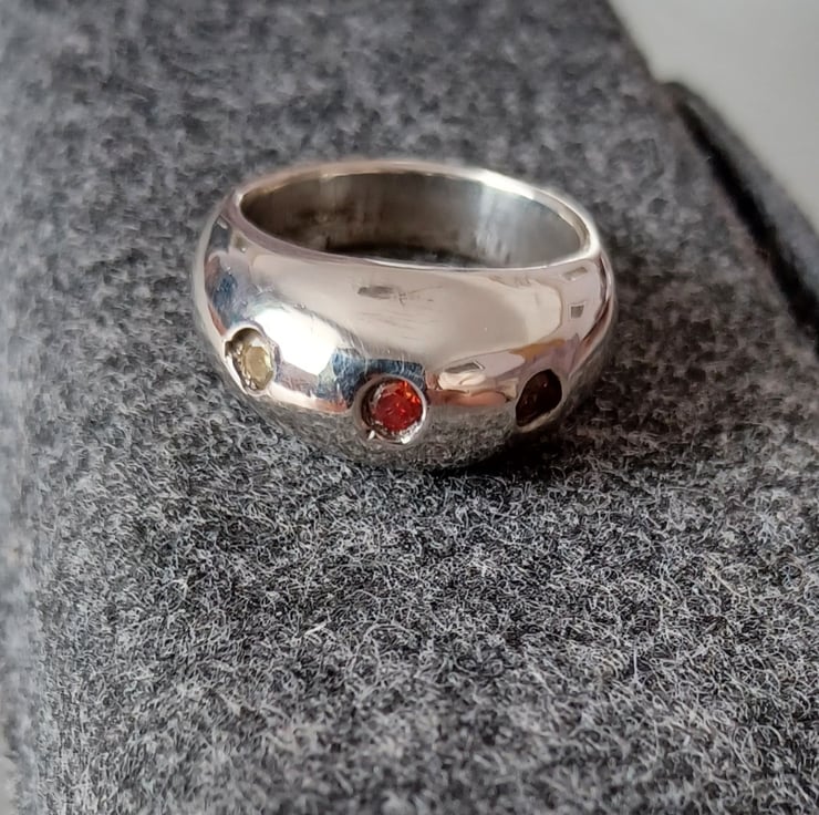 A heavy solid sterling silver bombe ring with three flush set 3mm cubic zicinia stones in red, yellow and orange. The ring is 8mm wide at the widest point and a UK size P: 57.2 mm circumference (US size 8)
