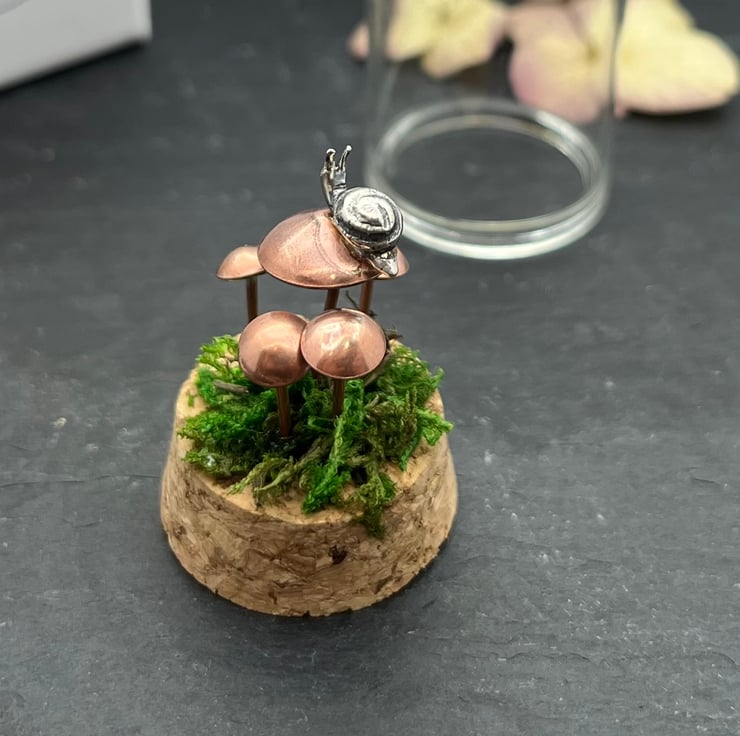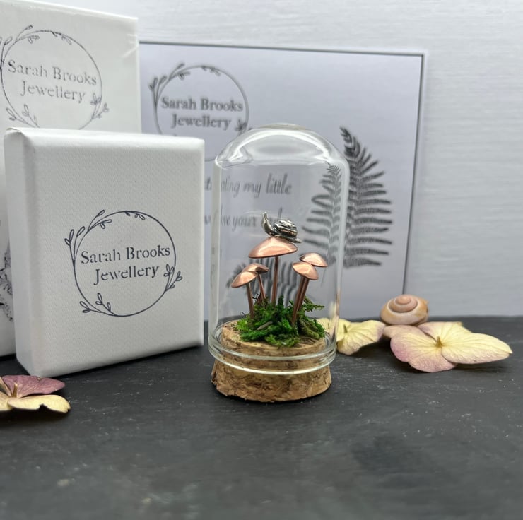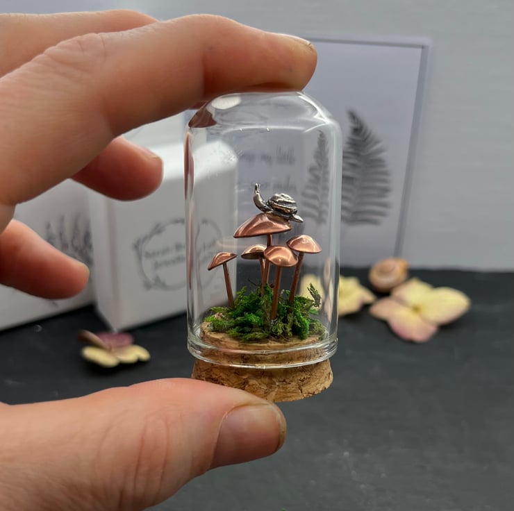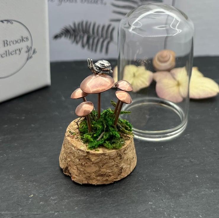 5 handmade copper mushrooms/toadstools, one is larger and has a sterling silver snail sitting on the top. In a cute little bell jar surrounded by moss.