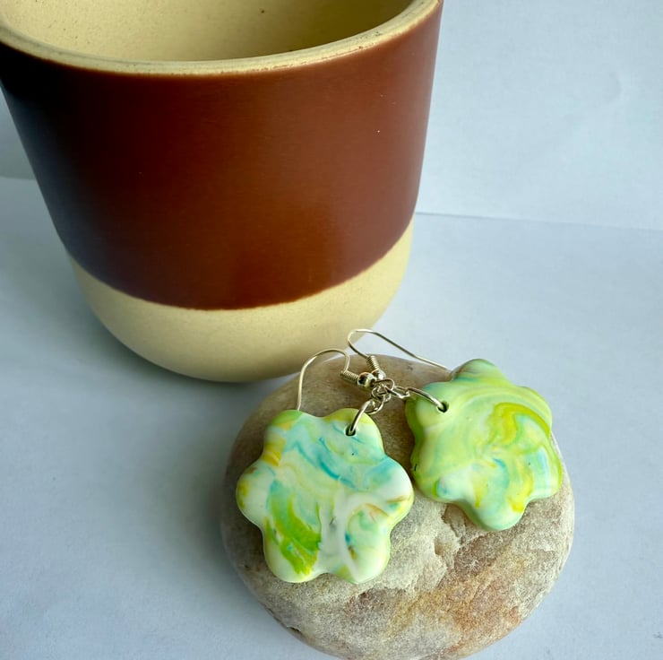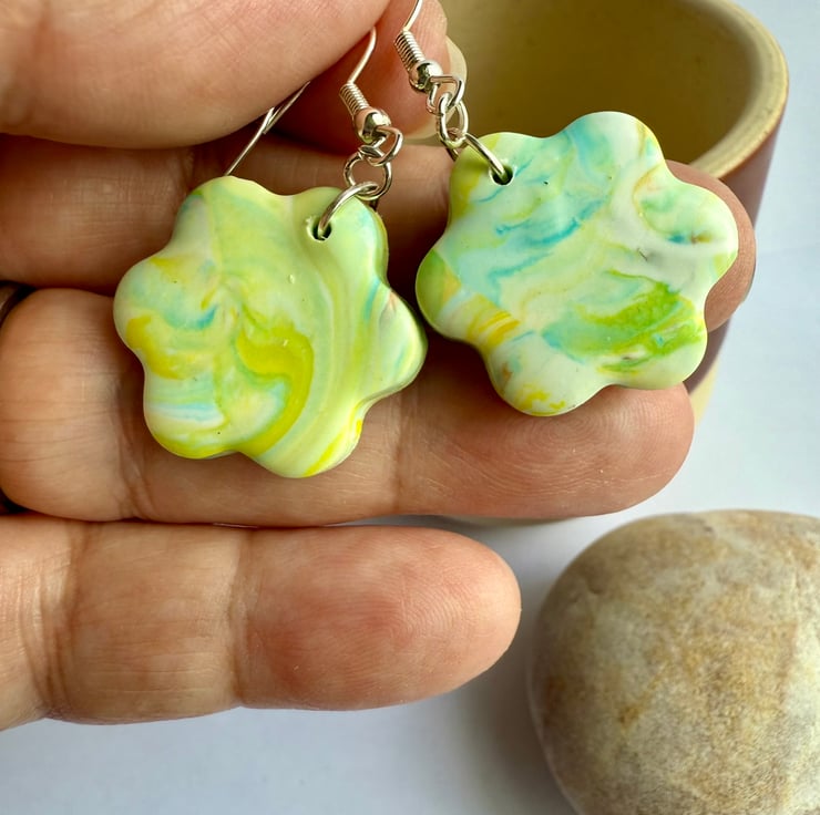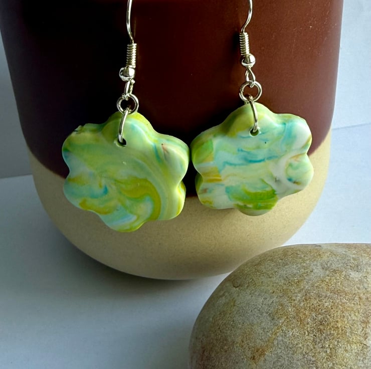 Handmade polymer clay flower shape drop earrings. These one of a kind pieces have colour tones that remind me of Nature. Greens for the forest, orange/yellow for the sun and blue for the sky. Super lightweight and hung on Sterling Silver hooks. Great for all day summer wear.