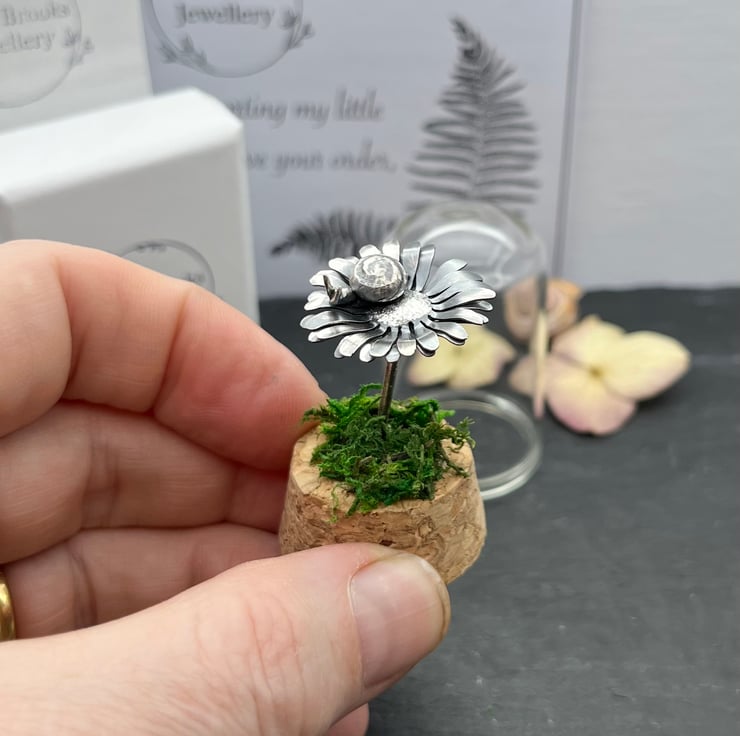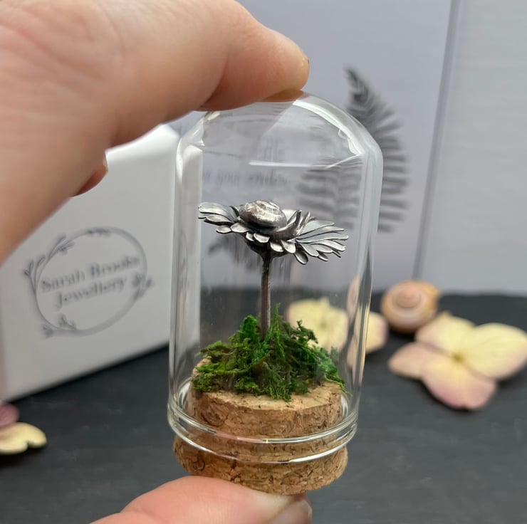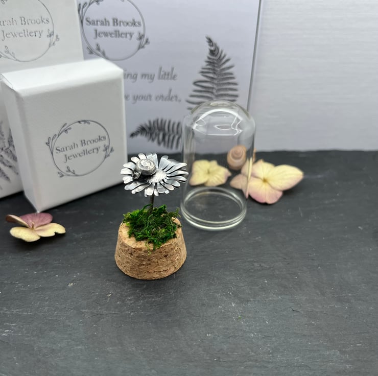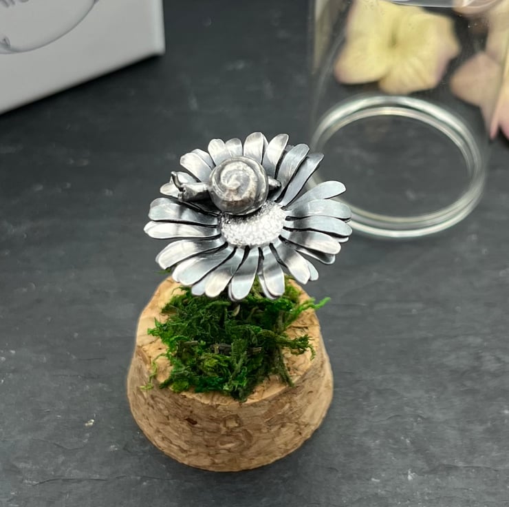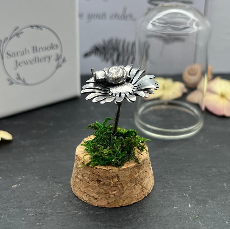 Handmade sterling silver daisy with a tiny snail resting on it. Set in a cute little bell jar surrounded by moss.
