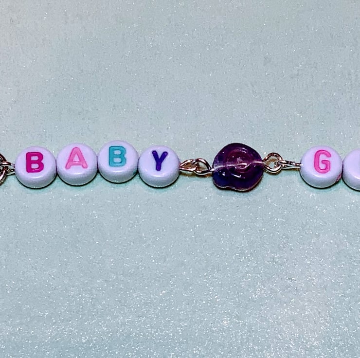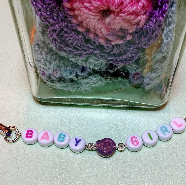The sentiments spell 'Baby Girl' in rainbow letter beads. Featuring a mini deep lilac rose bead and a stripe glass bead heart
