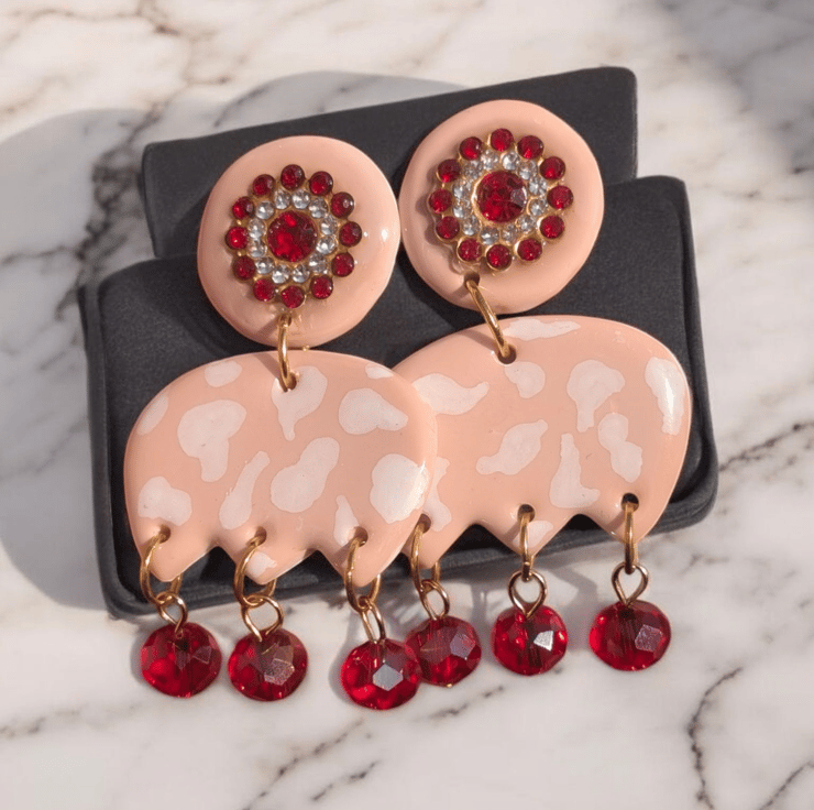 This Tribal earring is made of Resin, white Acrylic paint, Gold Findings, red crystal beads and finding, and Polymer Clay, a durable and versatile material that can withstand wear and tear, they are lightweight making them comfortable to wear for extended periods.