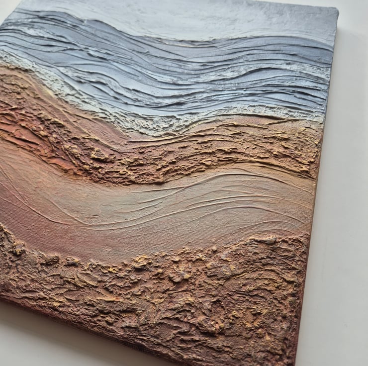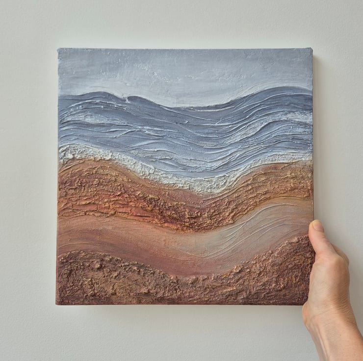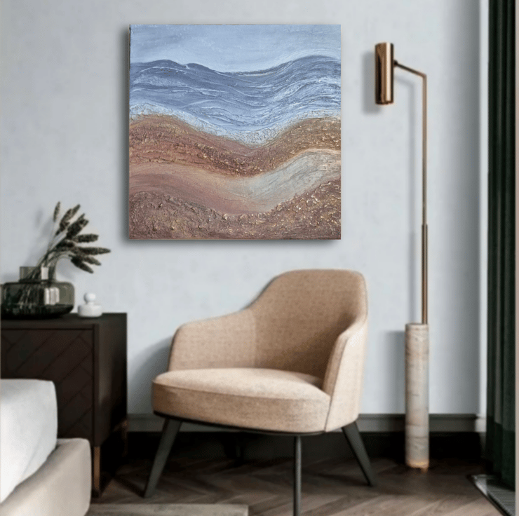 Bring a sense of calm and earthy elegance into your space with this one-of-a-kind textured seascape painting. Inspired by the natural meeting of land and sea.