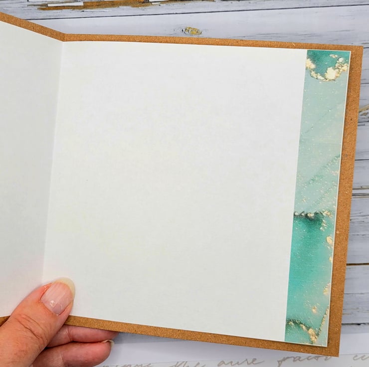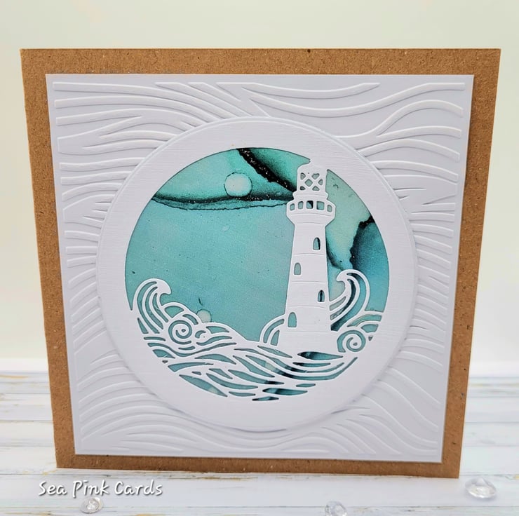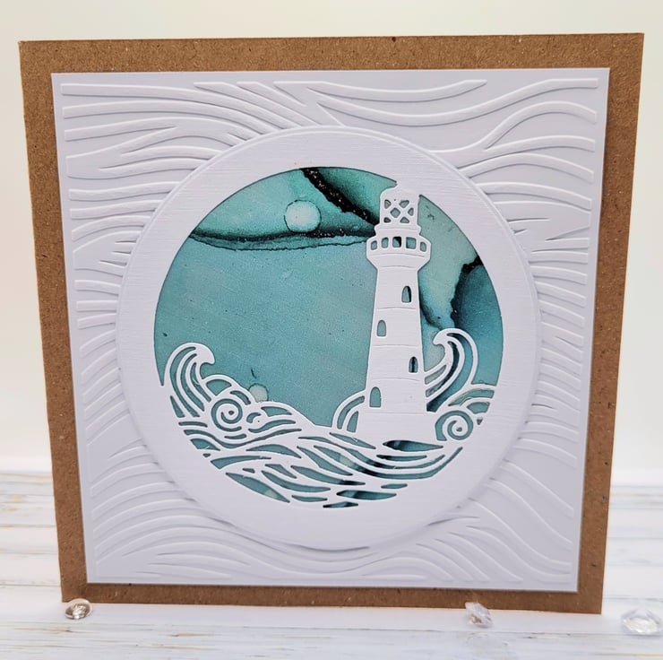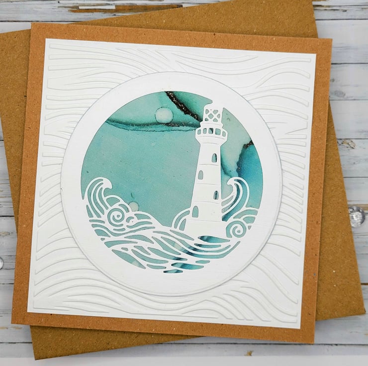 A beautiful lighthouse card that is blank and suitable for many occasions. This individually designed and handmade card measures 14.5 x 14.5 cms and has a 300gsm recycled kraft card base. The inside has a white insert with a matching decorative paper trim, great for writing a personal greeting or note. Textured and embossed, the lighthouse has a background of teal blue ink drop style paper.