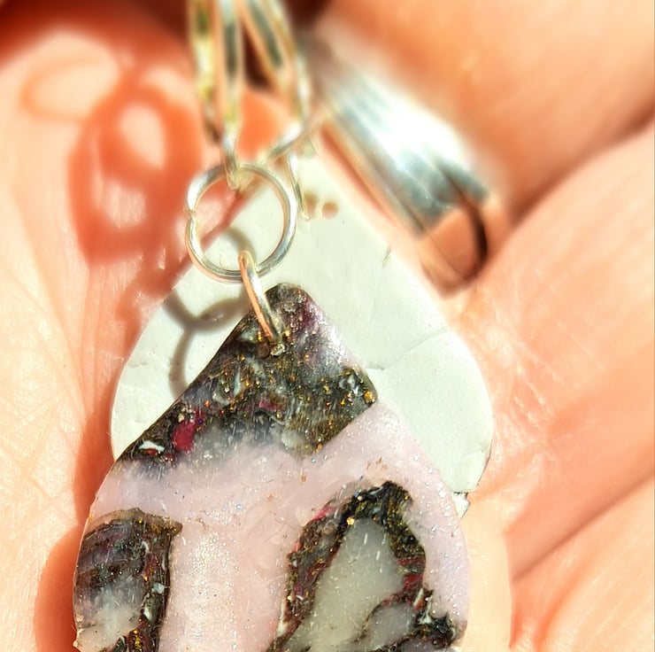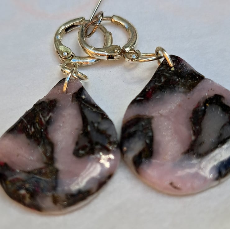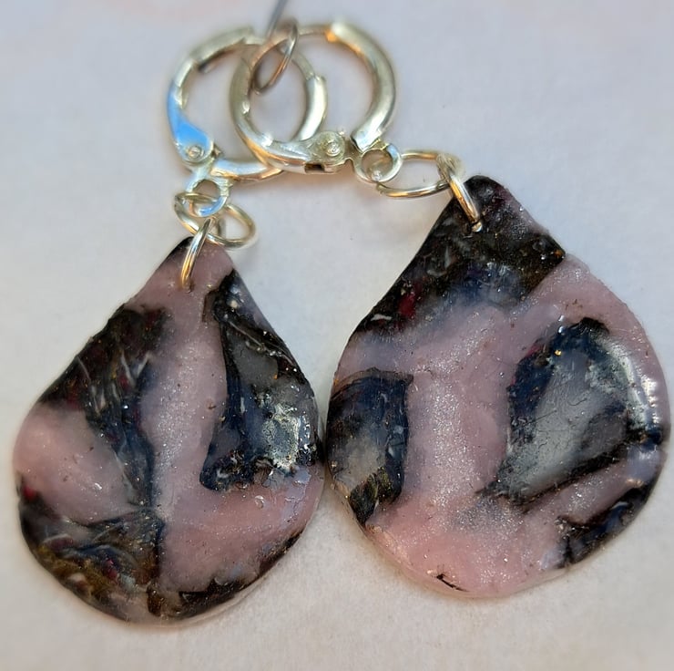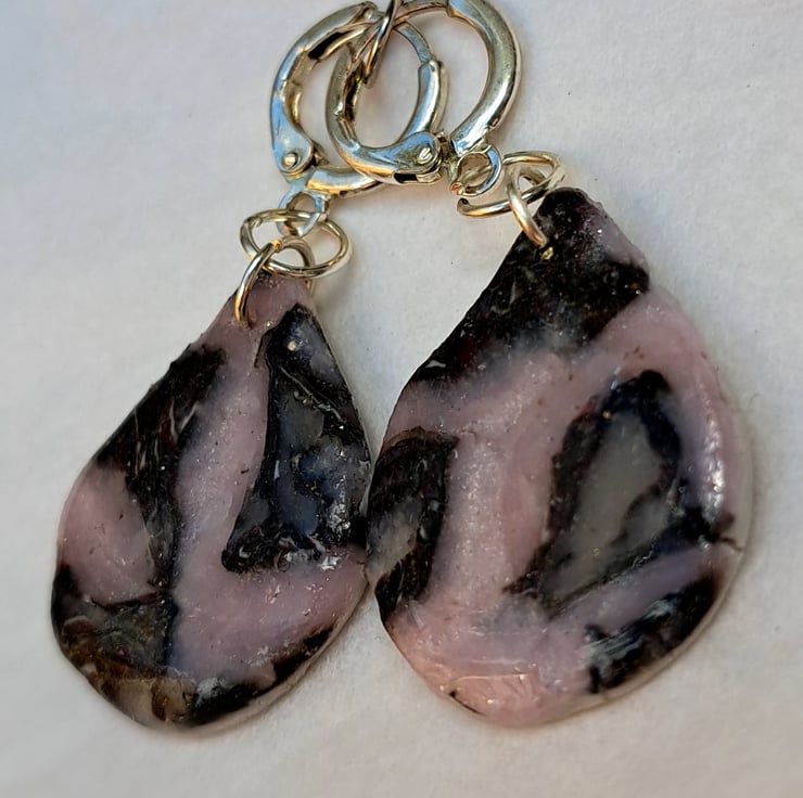 A lovely pair of earrings, teardrop shape, made with polymer clay, mostly pink/purple, silver and translucent. Finished with a coat of resin.