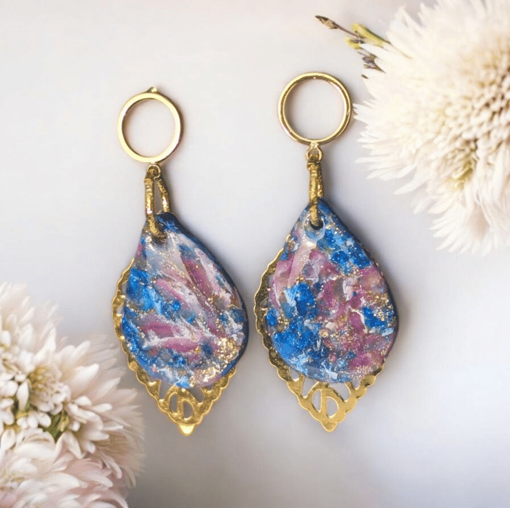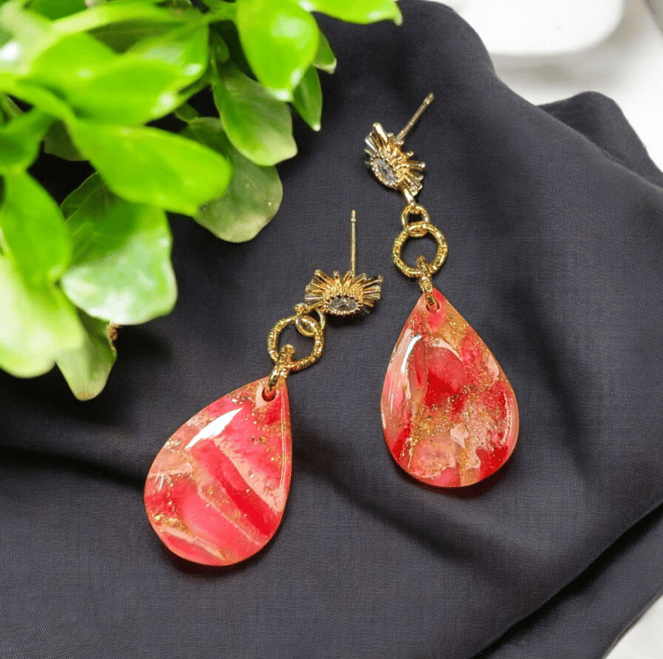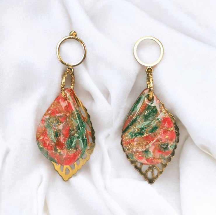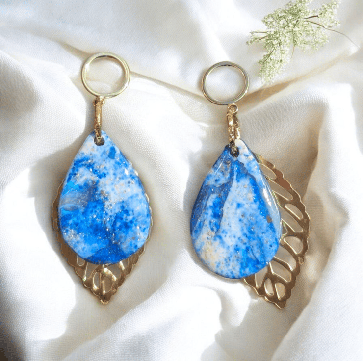 These earrings are made of Resin, Gold leaf, white Acrylic paint, Gold Findings and Polymer Clay, a durable and versatile material that can withstand wear and tear, they are lightweight making them comfortable to wear for extended periods.