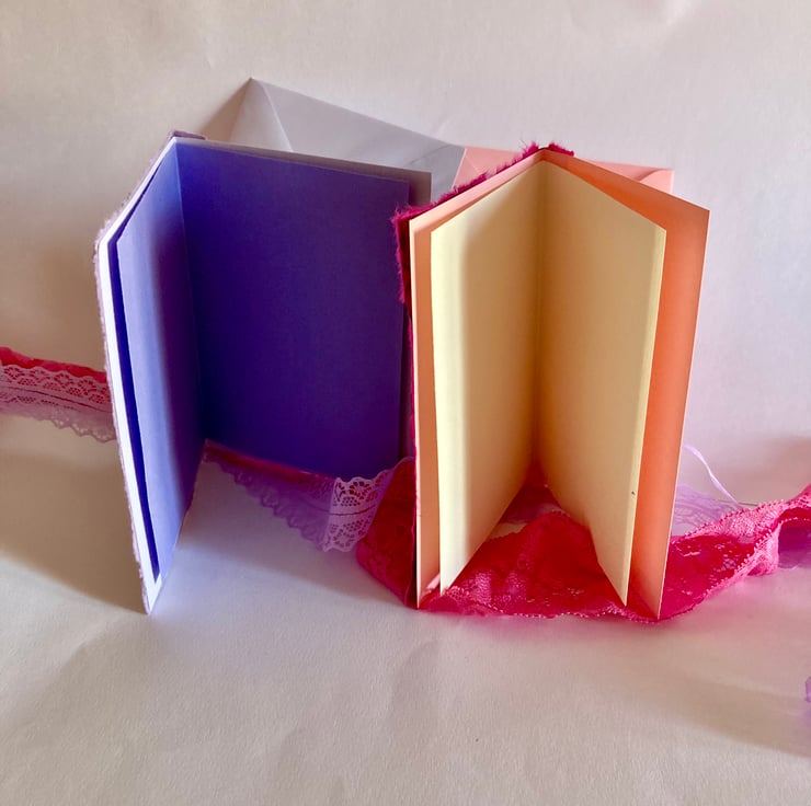 A green paper with mauve petals and black dots covers the front which has been torn at the edges for a softer finish. A braid of pink flowers with green leaves sits across the middle area