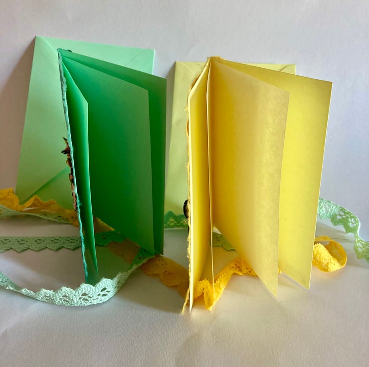 A mustard yellow paper with bees covers the front which has been torn at the edges for a softer finish.