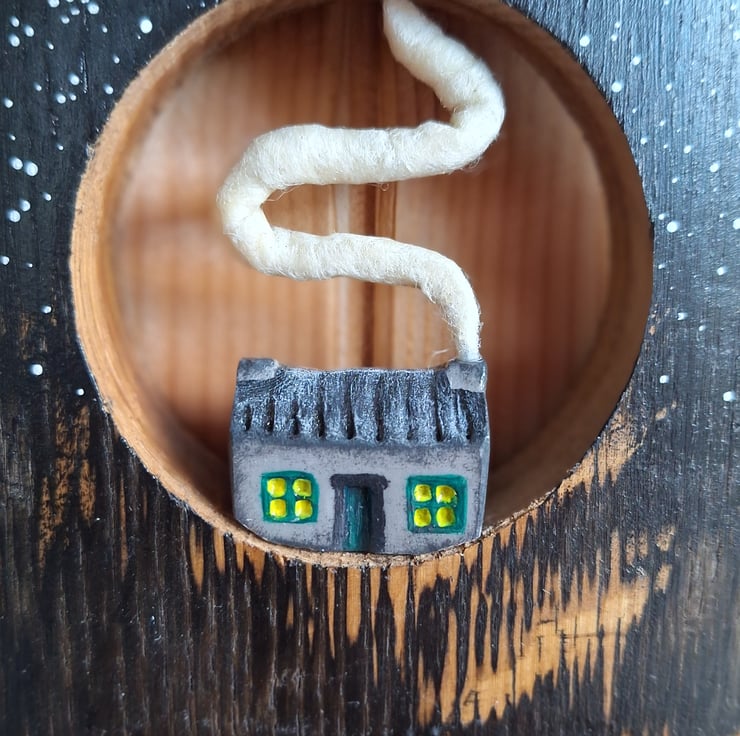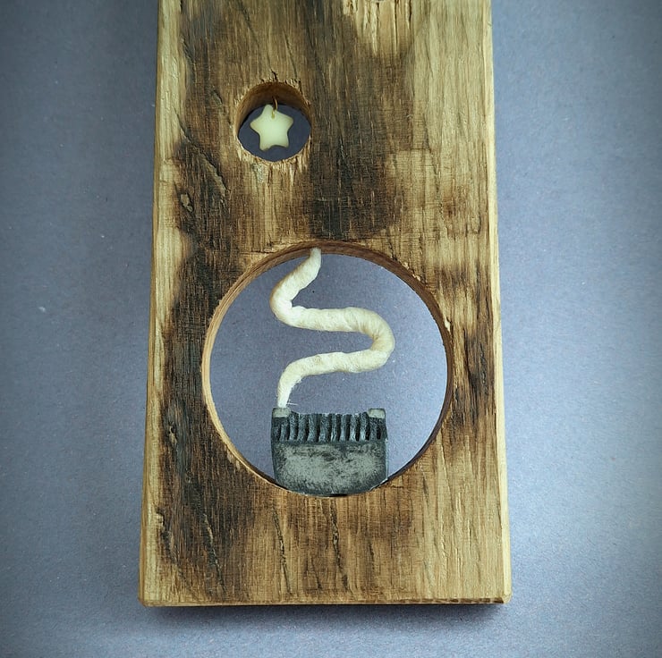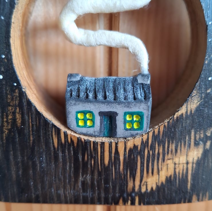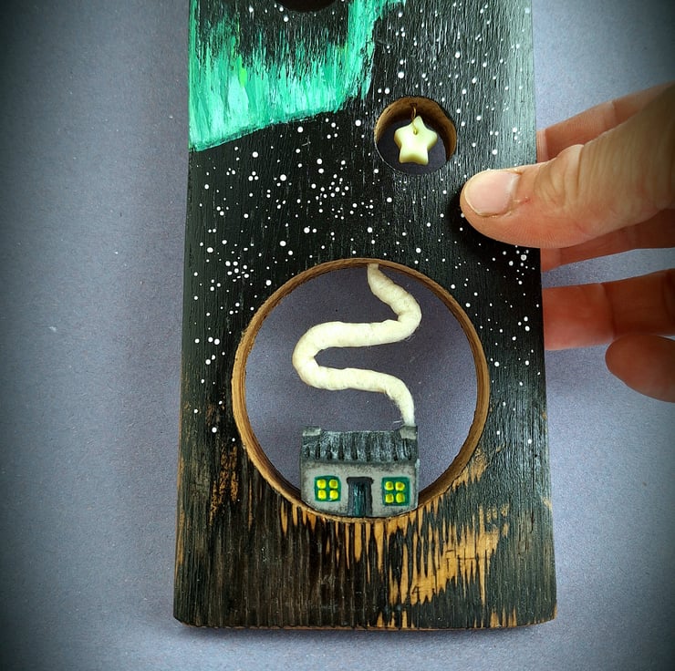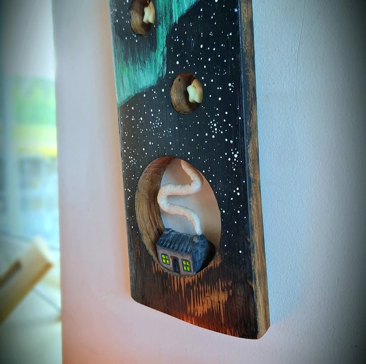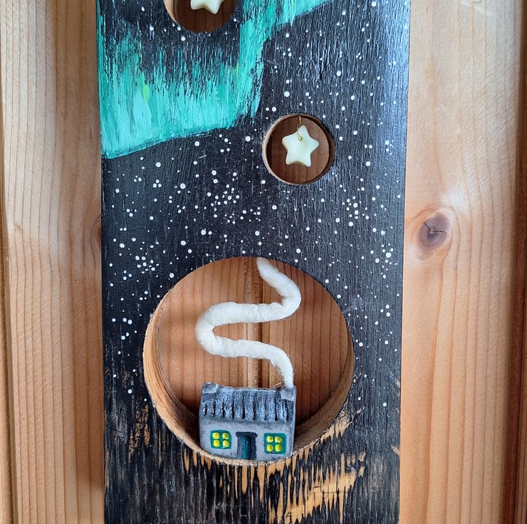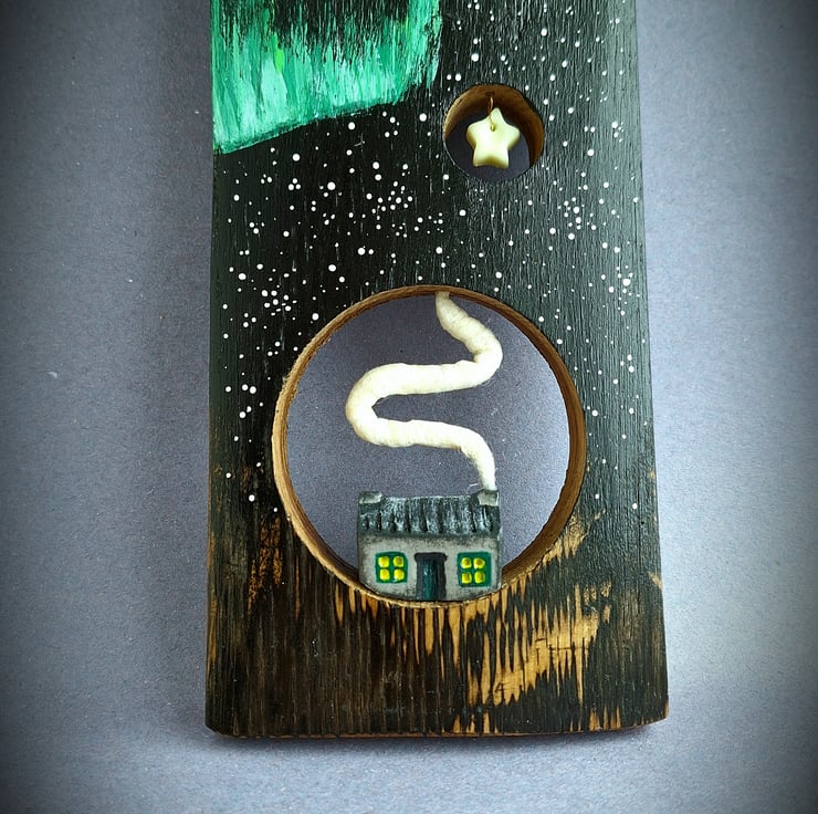 Made from a section of upcycled oak whisky stave, this piece featured a handmade polymer clay bothy with a plume of cosy chimney smoke. The Northern Lights have been painted in a blend of green arcrylics, with tiny glow in the dark polmer clay stars set into the night sky.