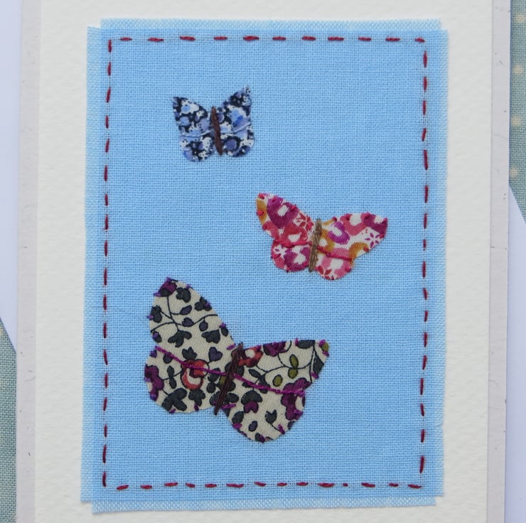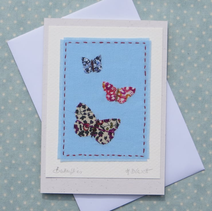 This is a small handmade greeting card featuring miniature hand-stitched applique butterflies cut from fine Liberty Tana Lawn cottons offered at a reduced price.