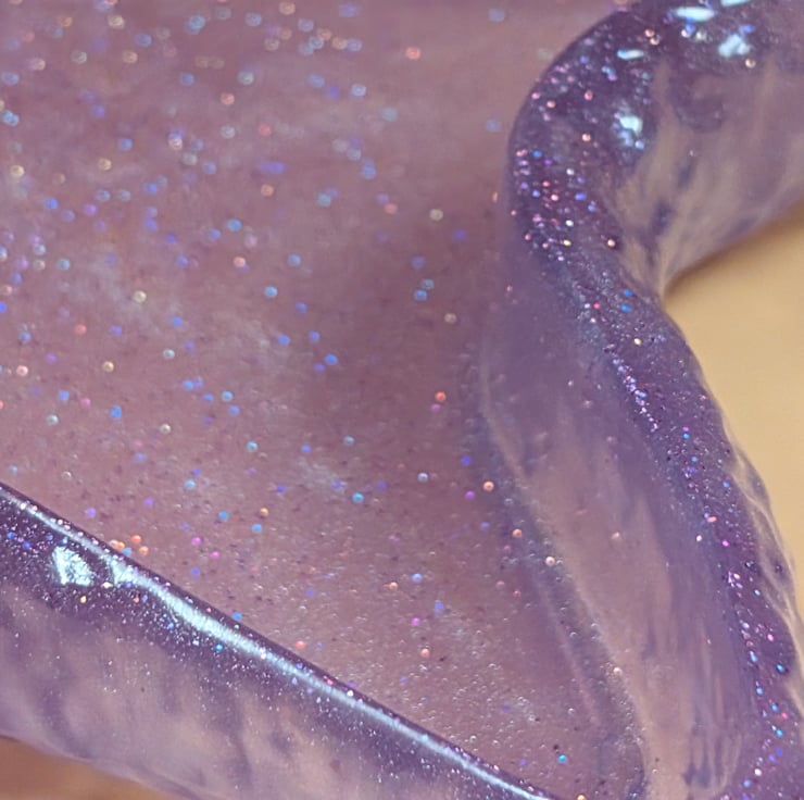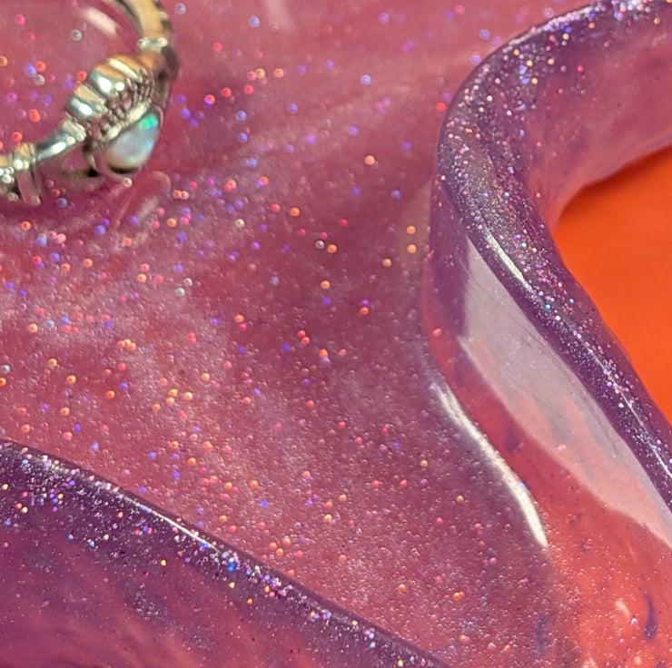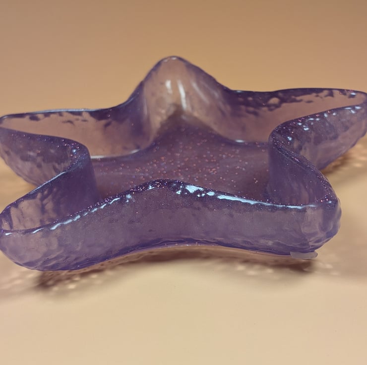 Bring a splash of starlit shimmer to your space with this handcrafted resin starfish trinket dish. Made with certified food-safe Craft Resin, this piece features a bold blend of translucent violet, fine glitter, and shimmering mica that dances in the light. The curved edges and rippled texture add a tactile, ocean-inspired charm.