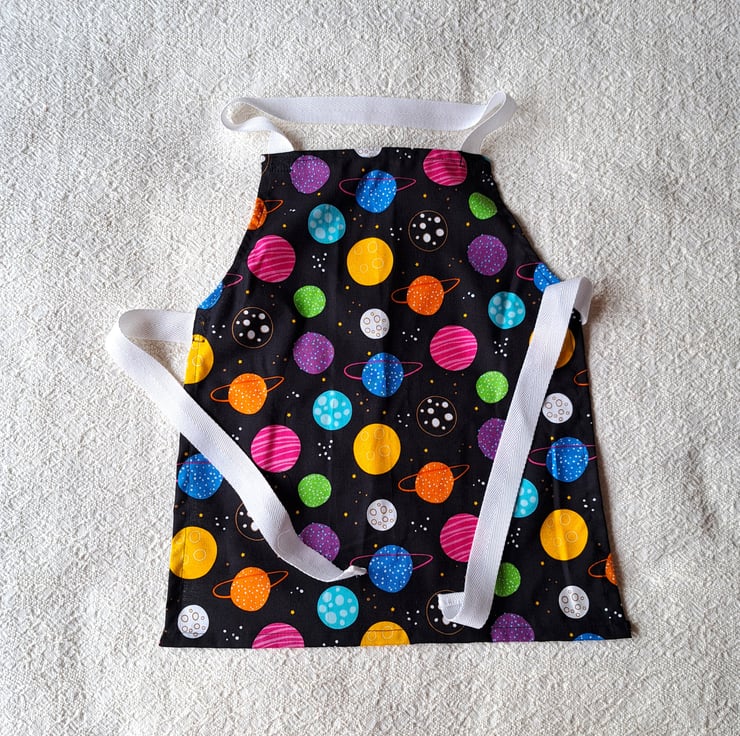 Colourful planets revolve against a black night sky on the surface of this lovely kid's apron. I have made it of good quality quilting cotton with acrylic herringbone straps. It measures 16.5" (42 cm.) from neck to hem and 15" (38 cm.) at the widest point, and should fit a child of between 2 and 6 years approximately. It is machine washable.