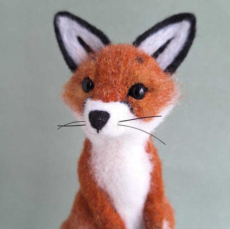 Coral the Fox has been hand made from felted wool around a wire armature. She has a gently poseable tail, glass eyes, real horsehair whiskers (from my own horses!) and is perched on an upcycled oak whisky stave. The stave has been sanded, but left with some imperfection to keep its character, then finished with an antique wax to bring out the beautiful colours in the wood.
