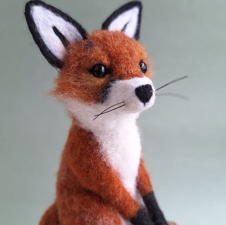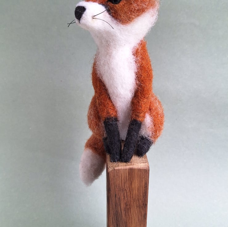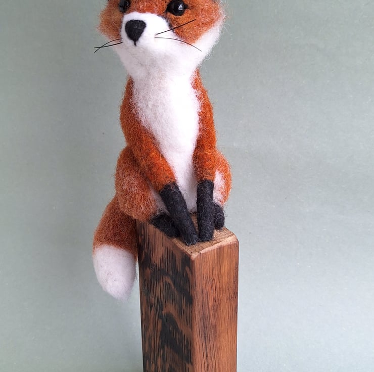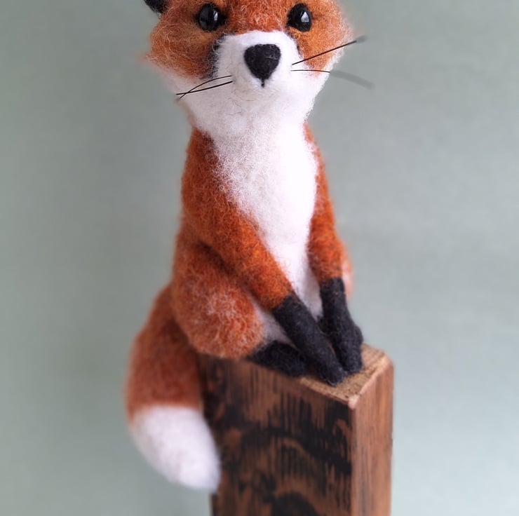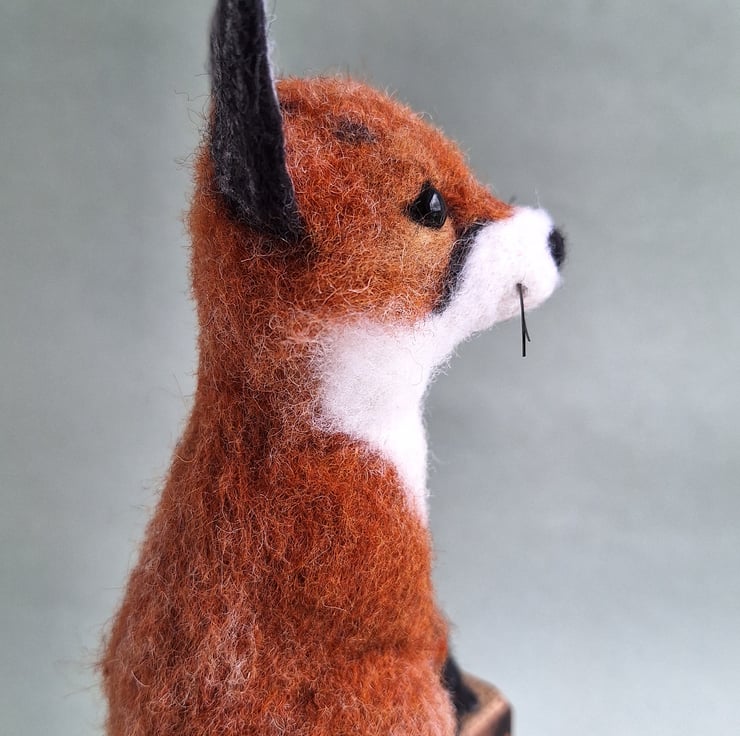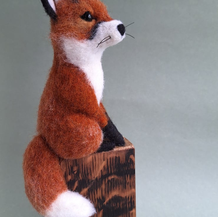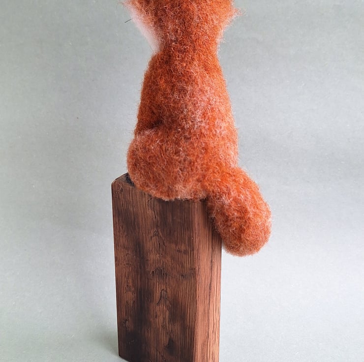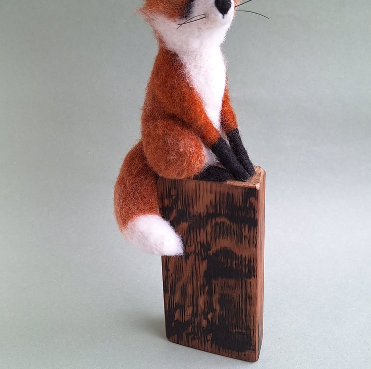 I love to upcycle materials and make them a home for felted creations. This Whisky Cask Stave is from a local distillery, and has made a great perch for this Foxy Character.