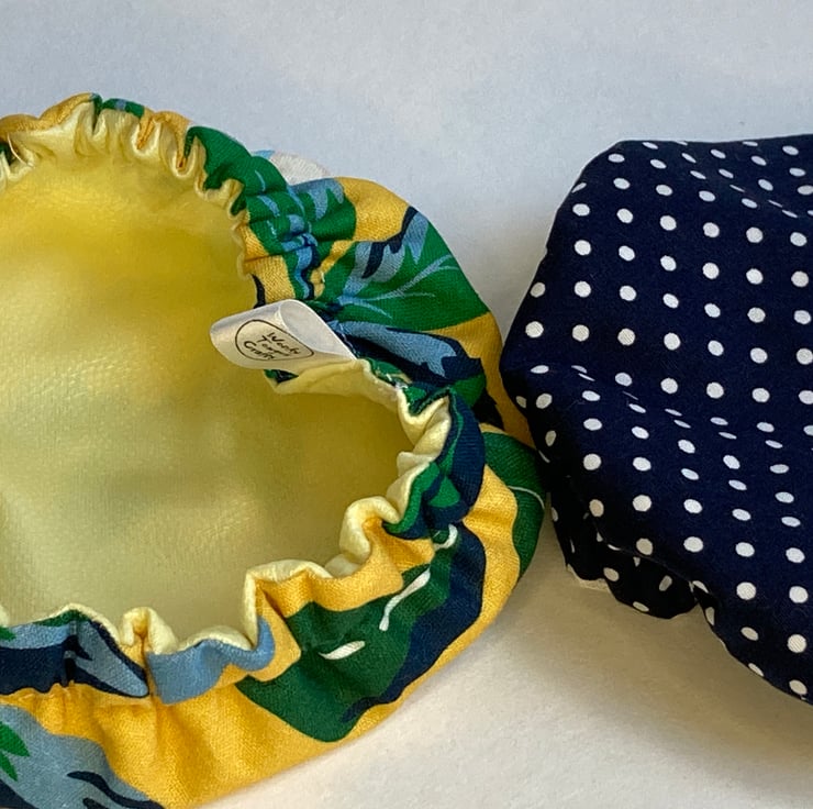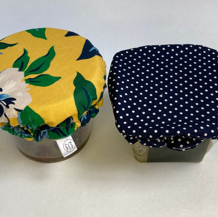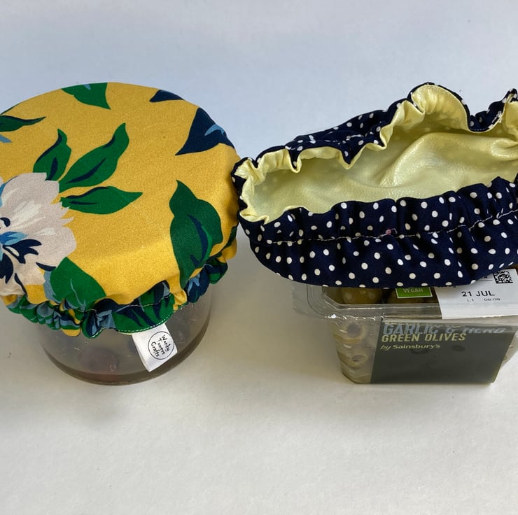 These covers are made from yellow and navy cotton fabrics and lined with yellow PUL - this a fabric that is laminated with a small amount of plastic. It is safe to be in contact with food, helps to keep it fresh but reduces the need for single-use plastics. An elasticated rim keeps the covers securely in place on your chosen dish or pot. They are washable by hand or machine, making them an hygienic option and I find they are much easier to use than beeswax wraps. These covers will fit bowls and pots of approximately 12 to 15cm diameter and the elastic means they will adapt to different shapes. They are perfect for larger pots of olives, whether round or square, that expensive Houmous that comes topped with pine nuts or a simple cereal bowl.