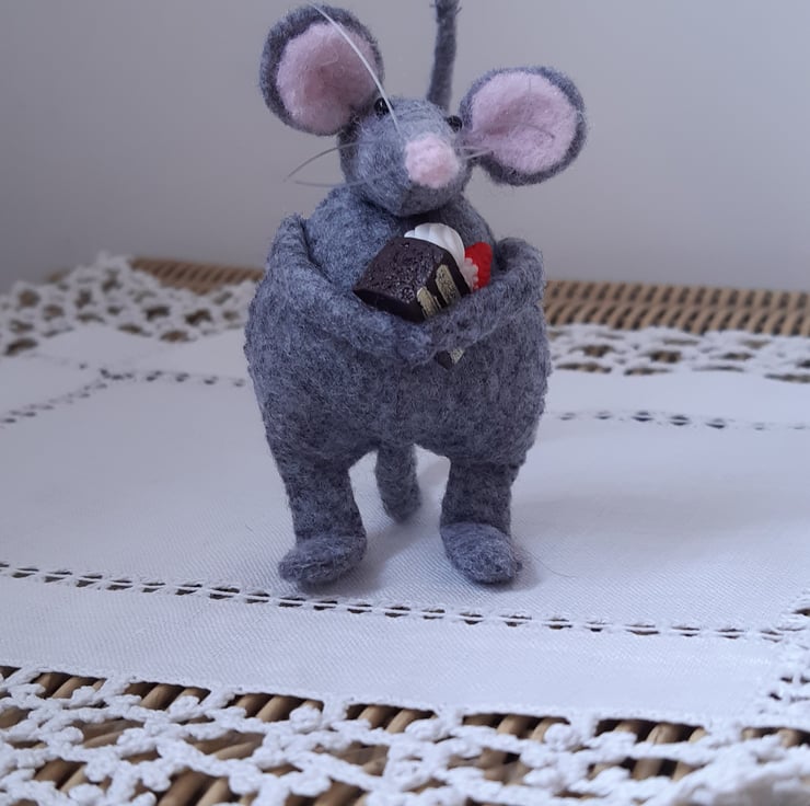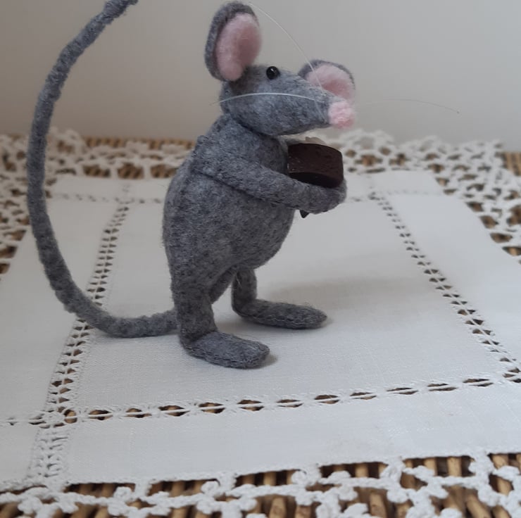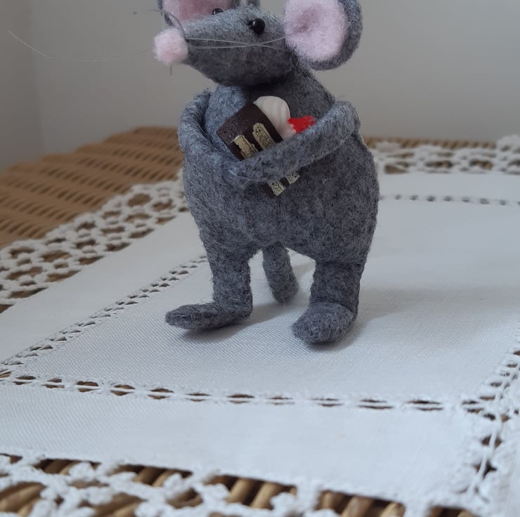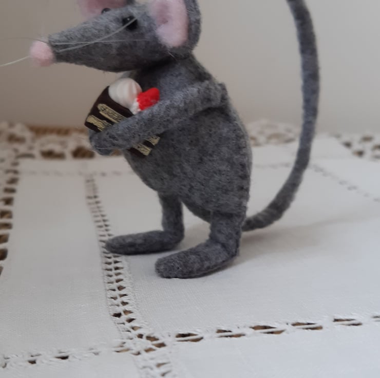 My little mice are 6 to 7cms tall. They are made from felt and stuffed with pollyfil. Their legs, arms and tails are posable due to wire inside of them. Its head is thread jointed and can be turned to the side. They have little black glass beady eyes and nylon whiskers. Each one is finished holding or doing something that shows its character e.g. the wine drinker, the big hearted mouse, the pizza maker, the gardener. They make great presents for friends and family and I am happy to personalise them further with requests, if I can. All handmade in The Little Mouse Atelier, London. They will be sent in gift packaging. Please note, due to small parts these are not suitable as toys for children.