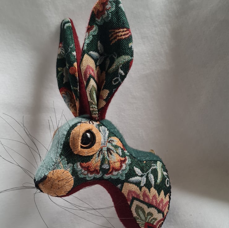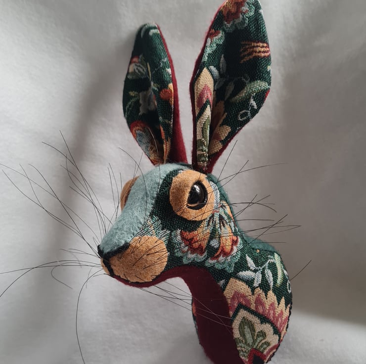 A lifesize faux hare which I have handmade and covered in hand stitched floral tapestryfabric. The head is backed with felt and has a metal hanger to hang it on the wall. It is lightweight.