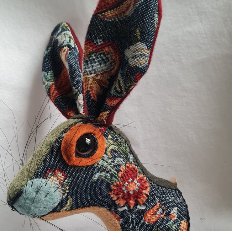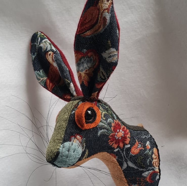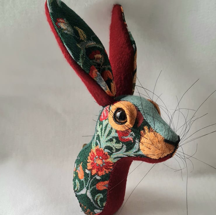 A lifesize faux hare which I have handmade and covered in hand stitched floral tapestryfabric. The head is backed with felt and has a metal hanger to hang it on the wall. It is lightweight.