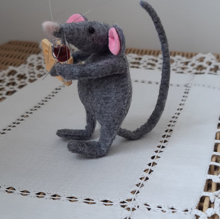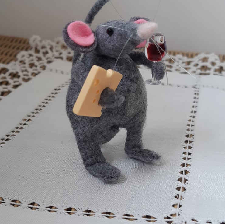 My little mice are 6 to 7cms tall. They are made from felt and stuffed with pollyfil. Their legs, arms and tails are posable due to wire inside of them. Its head is thread jointed and can be turned to the side. They have a small felted nose, little black glass beady eyes and nylon whiskers. Each one is finished holding or doing something that shows its character e.g. the wine drinker, the big hearted mouse, the pizza maker, the gardener. This one is very happy with its glass of wine and piece of cheese.They make great presents for friends and family and I am happy to personalise them further with requests, if I can. All handmade in The Little Mouse Atelier, London. They will be sent in gift packaging. Please note, due to small parts these are not suitable as toys for children.
