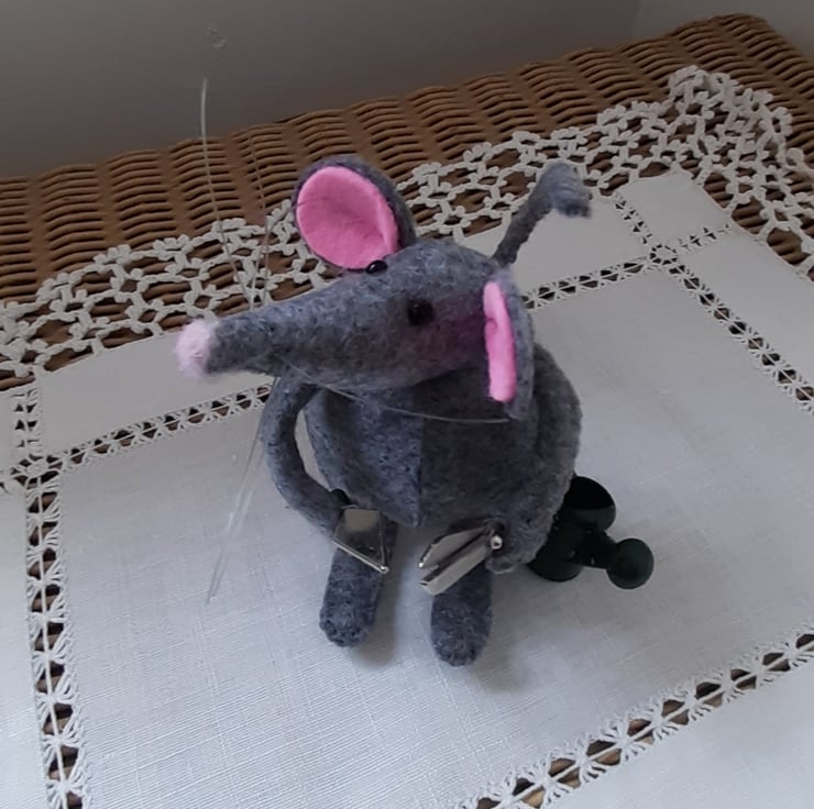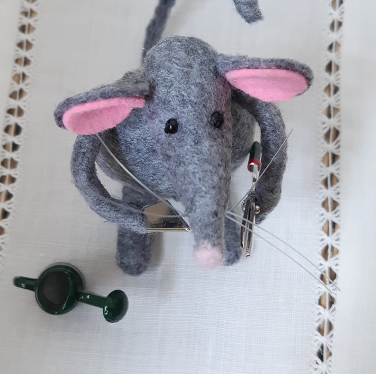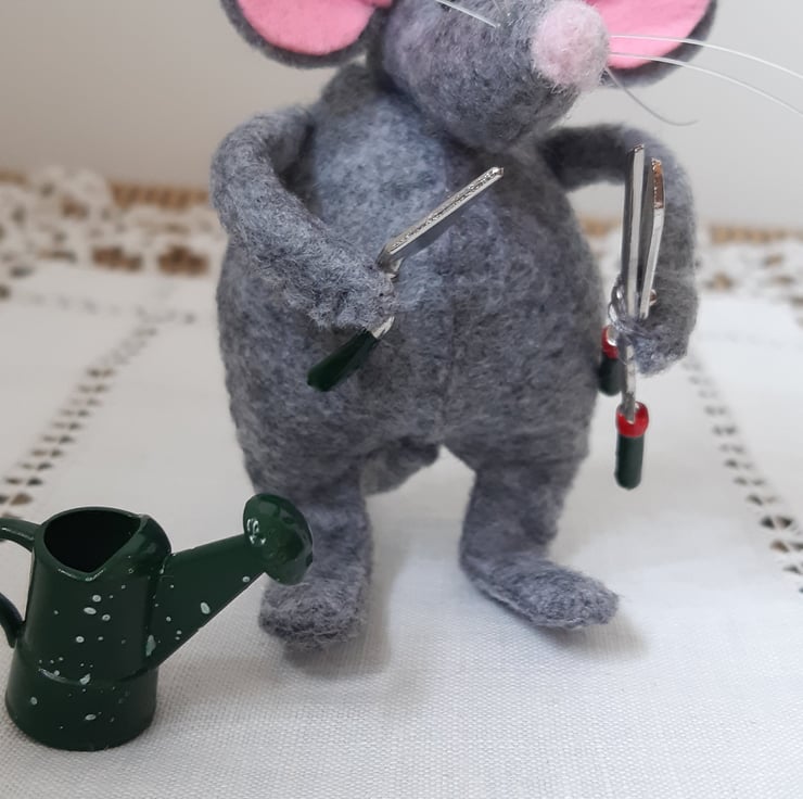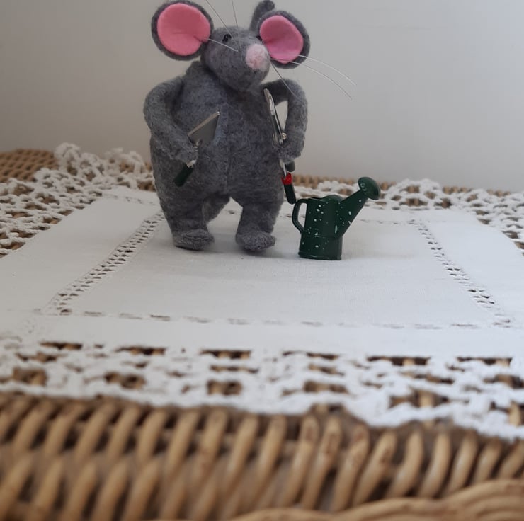 My little mice are 6 to 7cms tall. They are made from felt and stuffed with polyfil. Their legs, arms and tails are posable due to wire inside of them. Its head is thread jointed and can be turned to the side. They have a small felted nose, little black glass beady eyes and nylon whiskers. Each one is finished holding or doing something that shows its character e.g. the wine drinker, the big hearted mouse, the pizza maker, the gardener. This little mouse is happy when pottering in the garden, the two tools and the watering can are made out of metal. They make great presents for friends and family and I am happy to personalise them further with requests, if I can. All handmade in The Little Mouse Atelier, London. They will be sent in gift packaging. Please note, due to small parts these are not suitable as toys for children.
