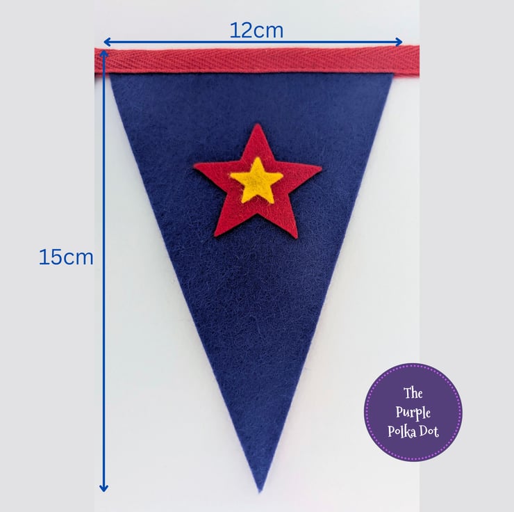 Each felt flag measures approximately 12cm x 15cm, making the total length of the flags approximately 120cm. Approximately 50cm of excess red bunting tape is provided at either end for hanging or tying. The flags are machine sewn on to the quality cotton herringbone one by one for durability.