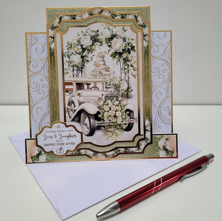 A beautiful statement wedding card featuring an image of a wedding car adorned with white roses next to a flower arch.
