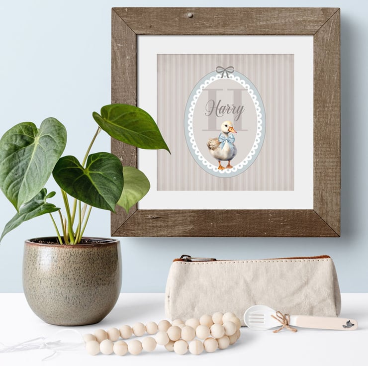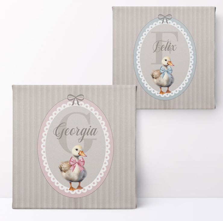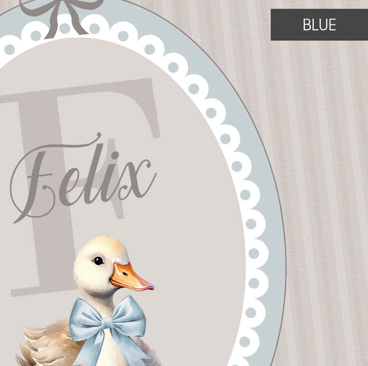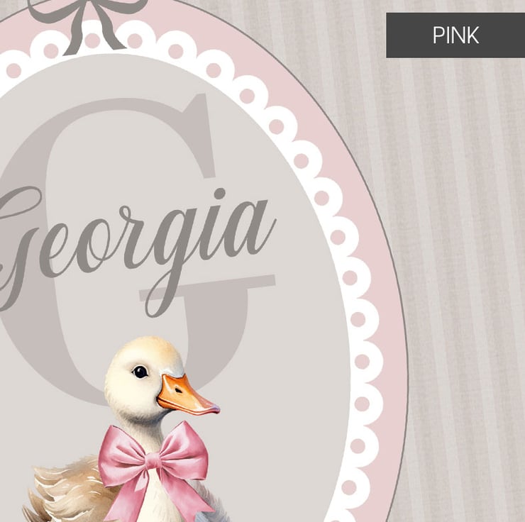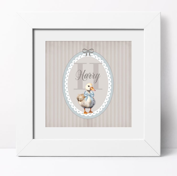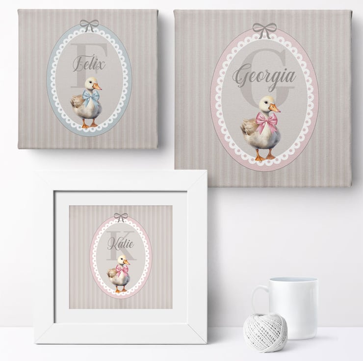 This adorable personalised Duckling Stripe print will add a touch of traditional, whimsical charm to your baby's nursery. Featuring a sweet little duckling wearing a pretty bow, the coquette print design has a lovely, timeless vintage feel and will look beautiful in a baby's bedroom. The gentle pastel tones and choice of colours make it perfect for baby boys or girls.