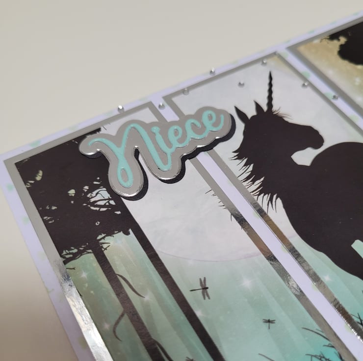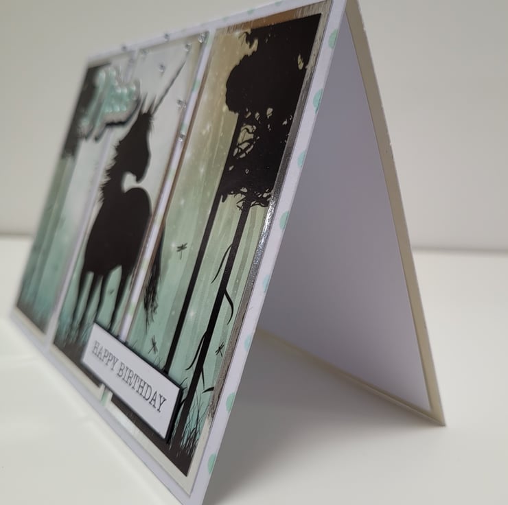 Featuring the silhouette of a unicorn set against a forest backdrop and a bright white moon, this silver, pastel green and black birthday card certainly has a touch of magic about it.