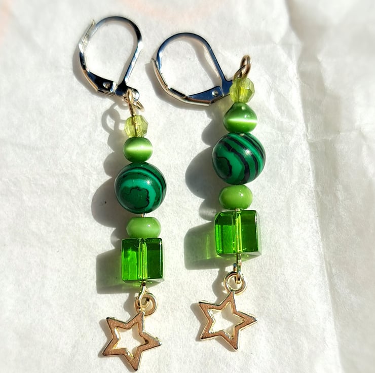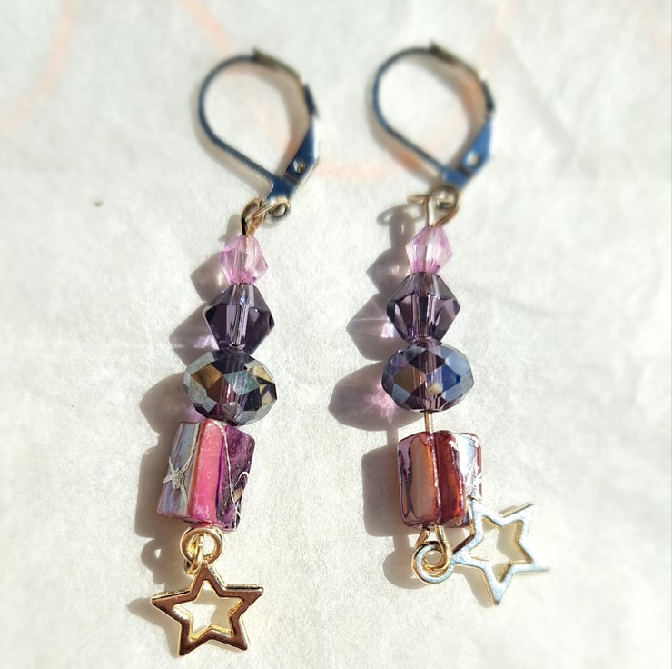 A lovely pair of handmade dangle earrings. A selection of colours and styles, all finished with a dangle star. Blues, greens, purples, pinks, orange and yellow.