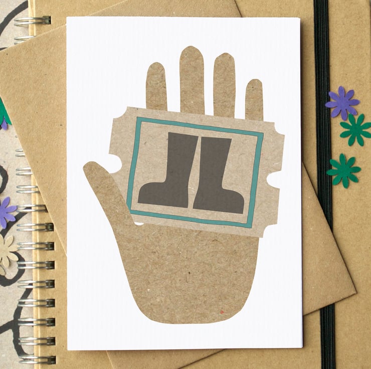 Not all gifts are wrappable, and that's why I have created a range of cards for "unwrappable gifts". This little card features a simple image of a hand holding a voucher with a pair of welly boots.