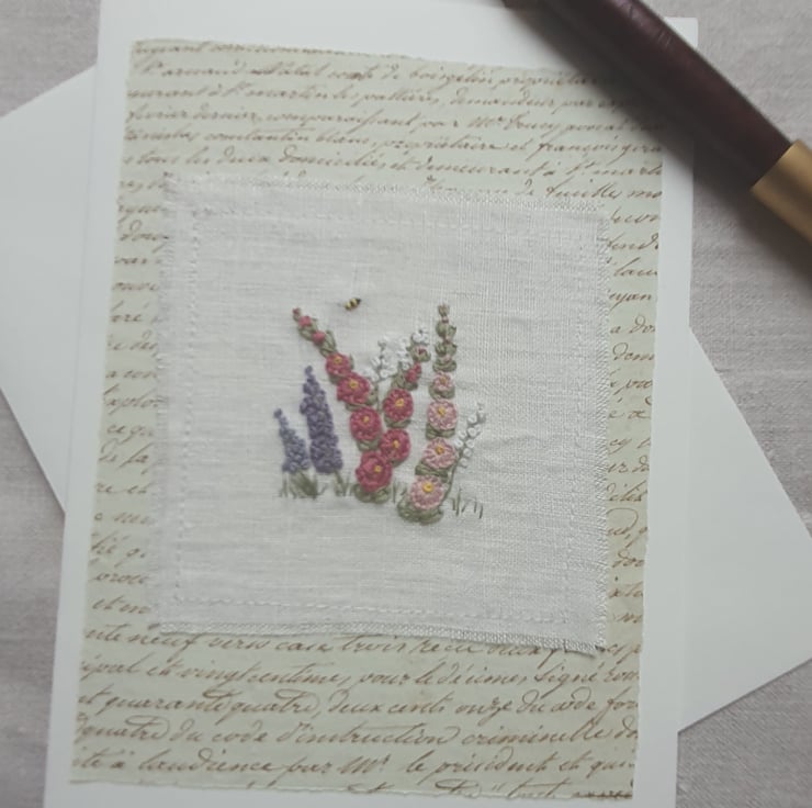 More than a card! Hand embroidered on vintage linen and mounted on a piece of vintage manuscript on a blank card for your own message. Ideal for when you want to give more than a card as this beautiful card can be framed afterwards.