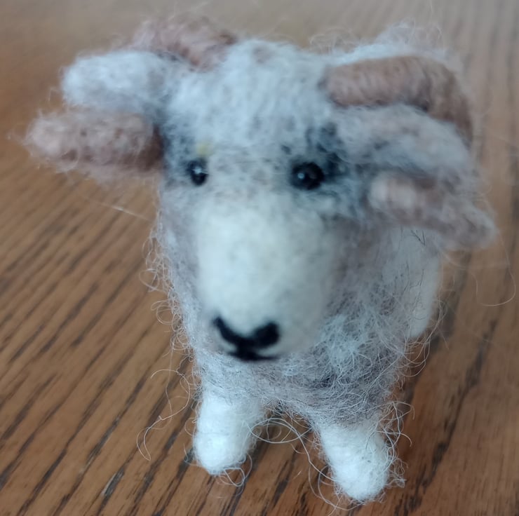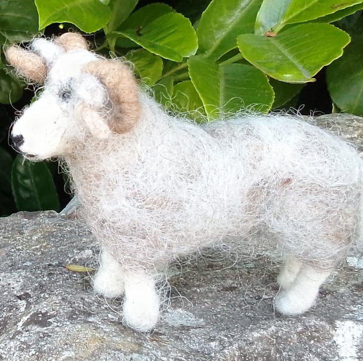 Mini needlefelted sculpture of a Shetland sheep ram. 11cms long, 9 cms high. Shetland wool pelt on a wire frame with glass eyes. Shetland wool comes in many beautiful subtle colours, this little guy is light grey.