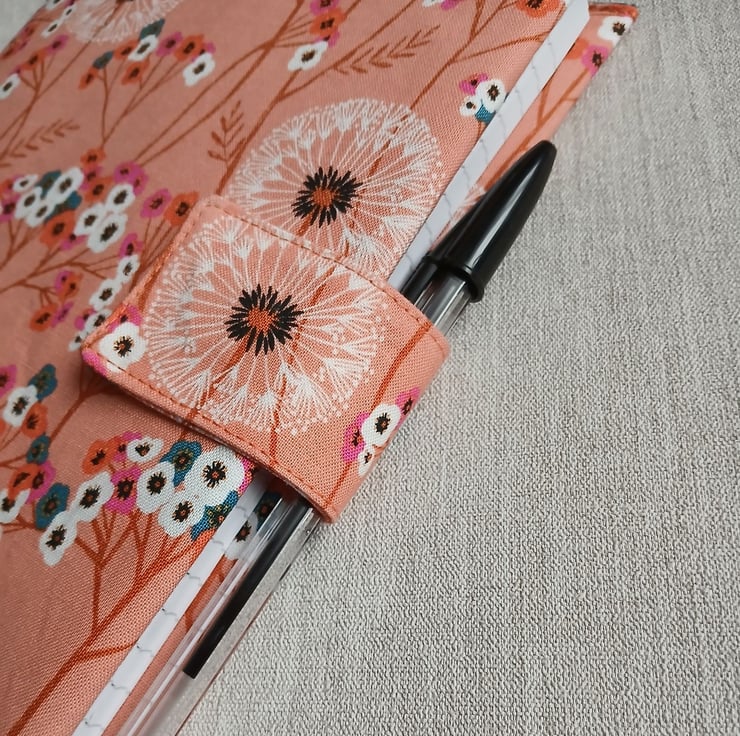A lovely, quirky notebook cover, complete with notebook and pen, in a print of dandelion clocks and small flowers on an orange background. The lining picks up on the little teal flowers and the cover incorporates a ribbon place marker, elastic pen loop and a magnetic strap fastening. Comes complete with a lined A5 notebook and pen. If you wish you can upgrade the pen to a Parker Jotter for £5.00 extra.