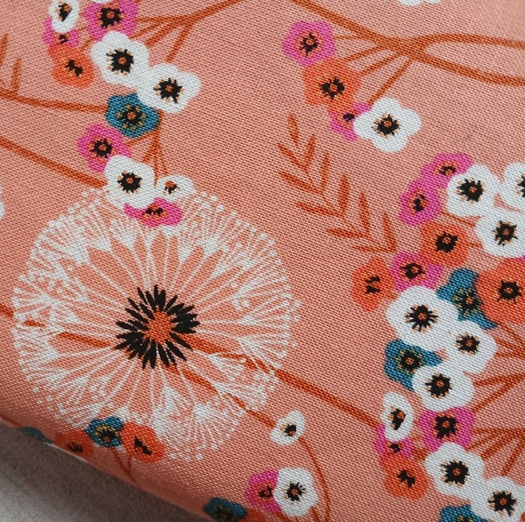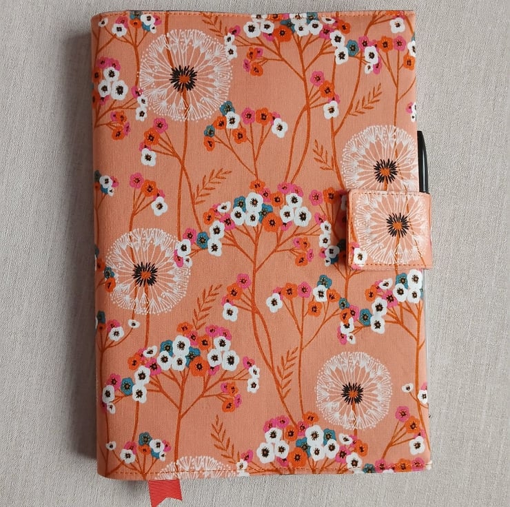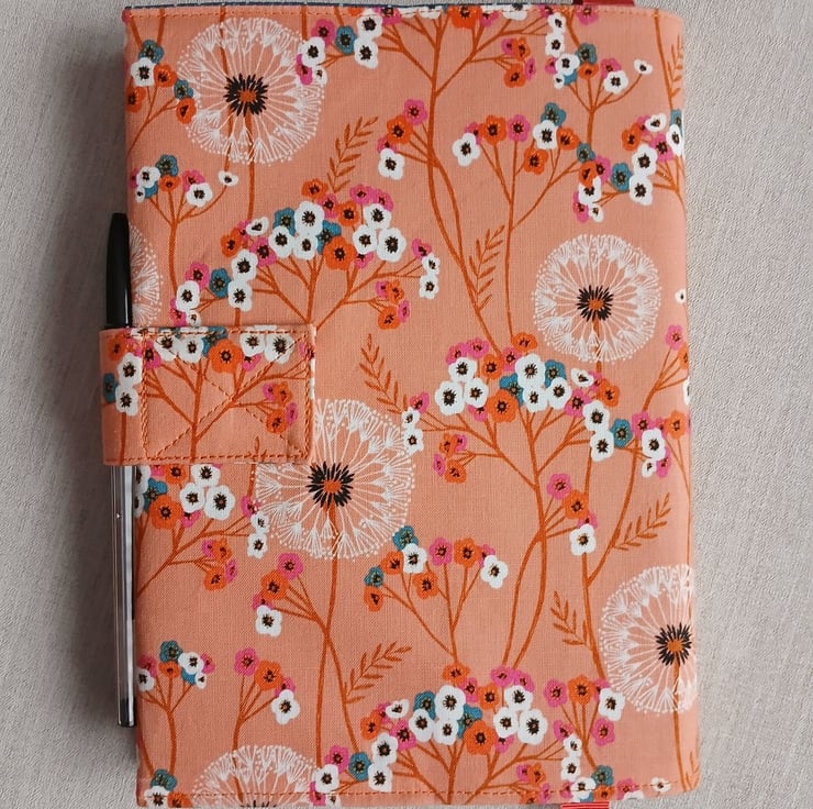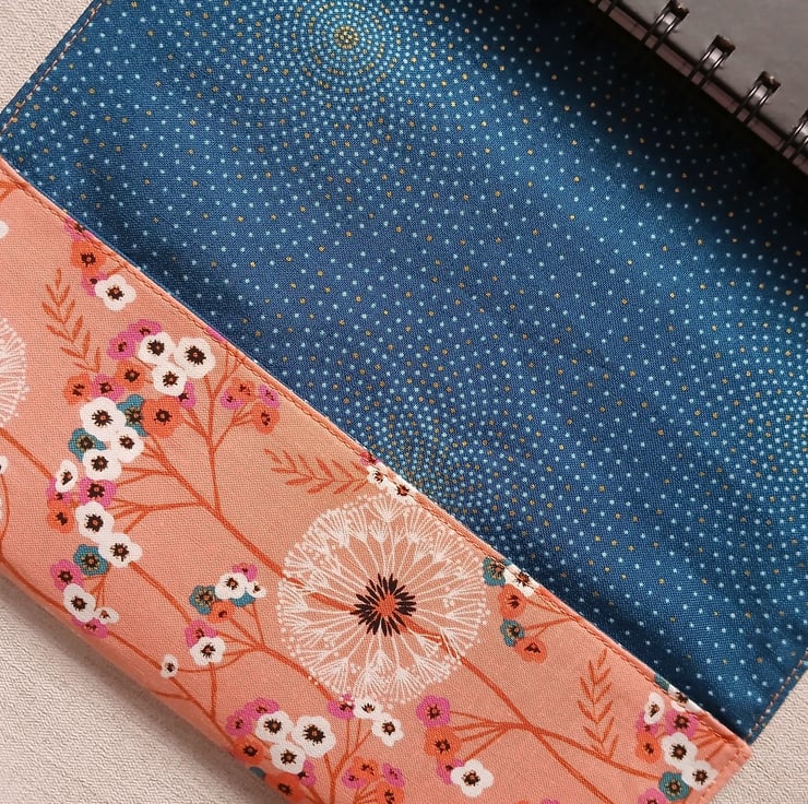 A5 Reusable Fabric Notebook Cover - Dandelion Clocks on Orange with Teal Lining