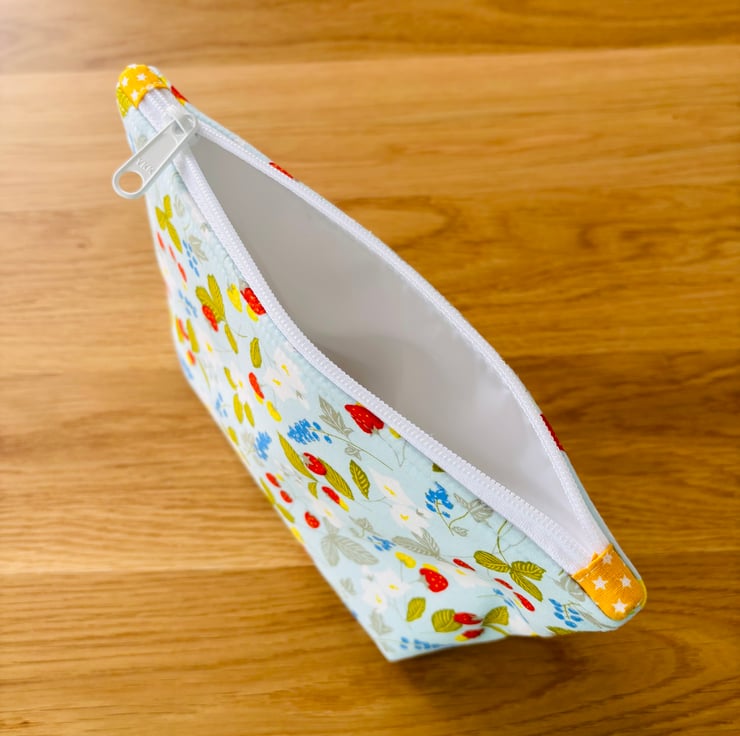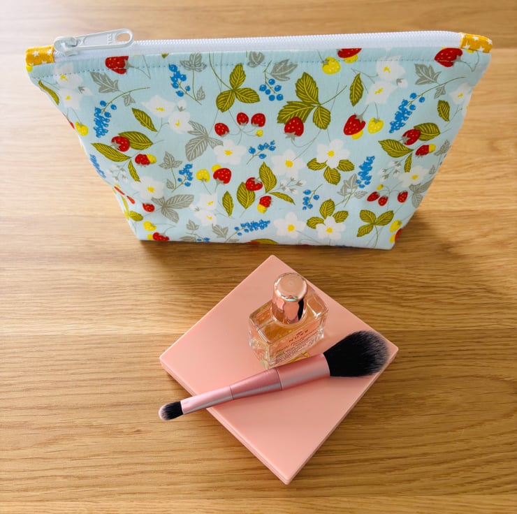 Handmade zipped fabric pouch perfect for make up or small toiletries, in a pale blue cotton fabric with a fun strawberry and floral print.