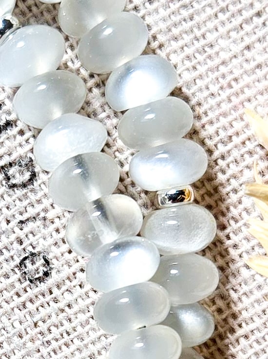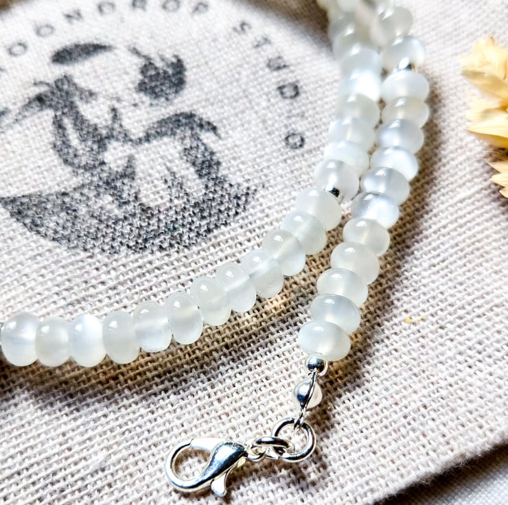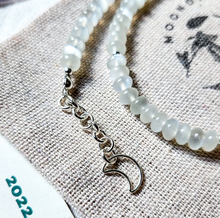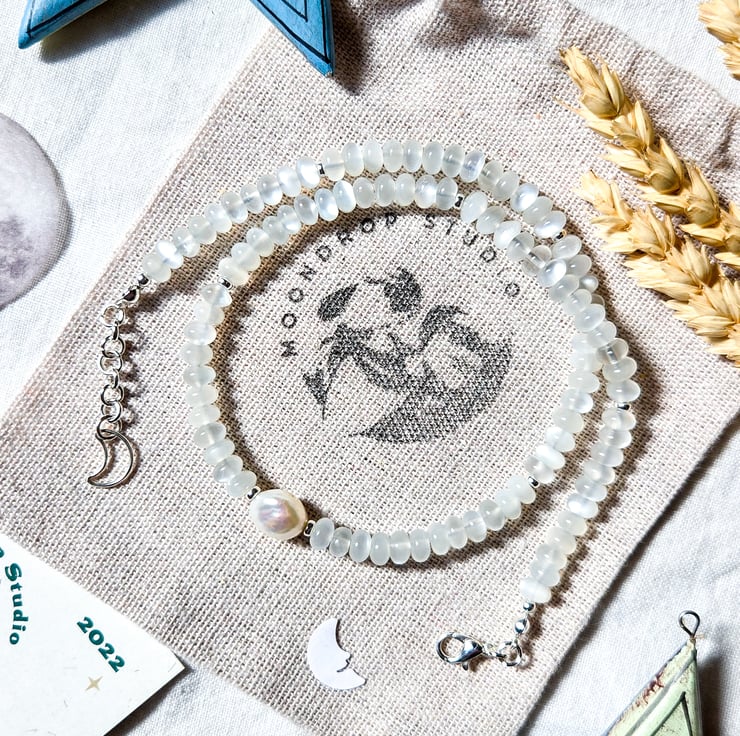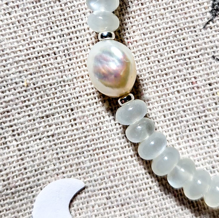 This handmade necklace features soft, glowing White Moonstone rondelles - each one around 6mm - and a single chunky rainbow iridescent freshwater pearl in the centre. It’s finished with sterling silver components and a tiny crescent moon charm at the clasp for a little extra magic!