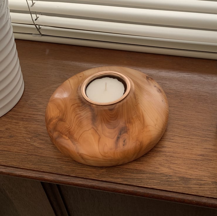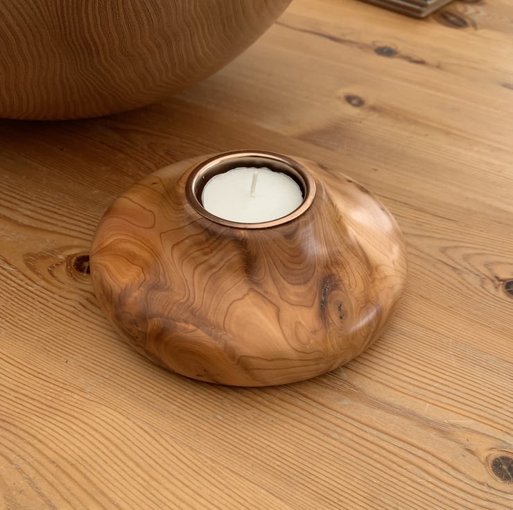 English yew the tea light it has copper inserts which make the piece fit for purpose 145 mm diameter and 45 mm high finished with a modern durable lacquer.