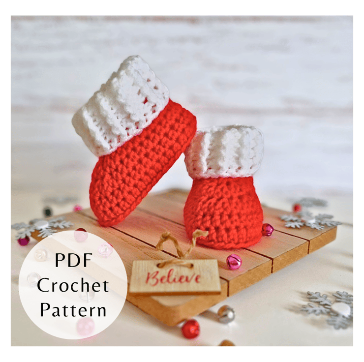Make your own baby booties with this PDF crochet pattern featuring a soft ridged cuff design. Some knowledge of FPDC and BPDC would be helpful, but the pattern does include photo tutorials. This pattern creates a modern, textured finish that’s perfect for baby shower gifts, newborn keepsakes, or thoughtful handmade presents.