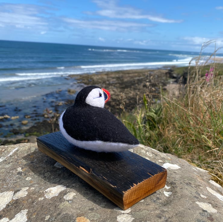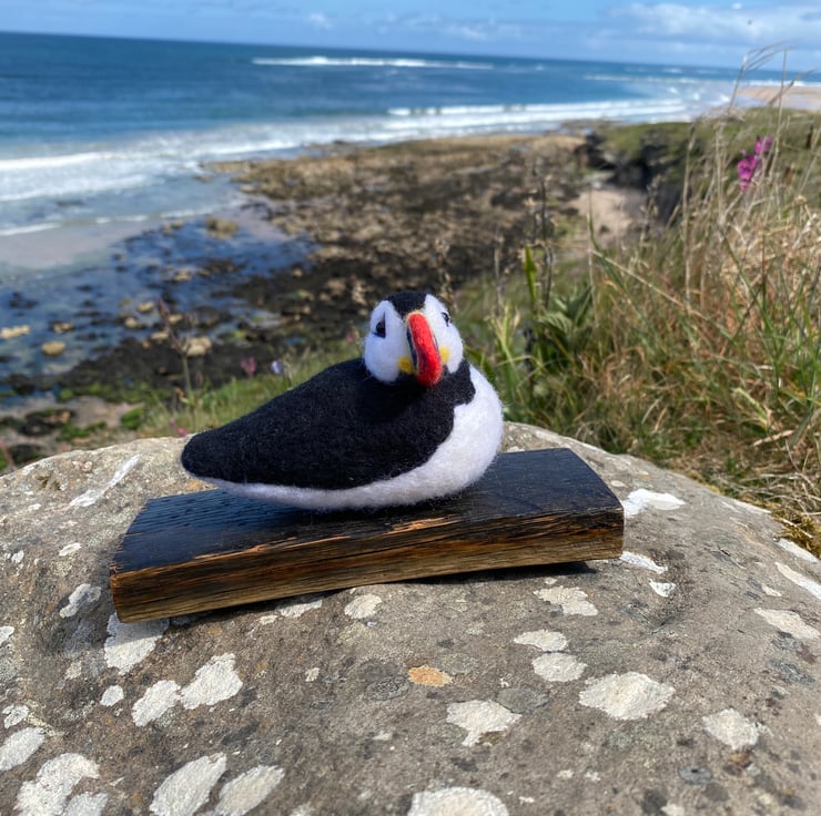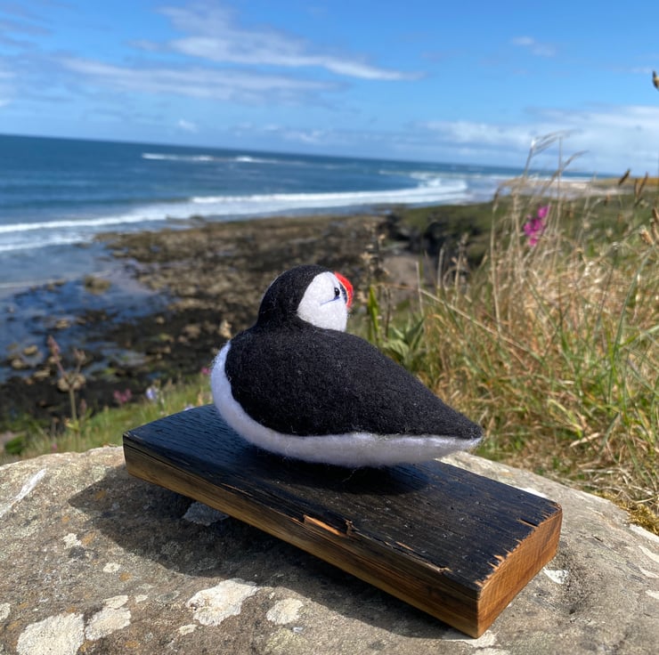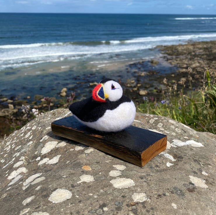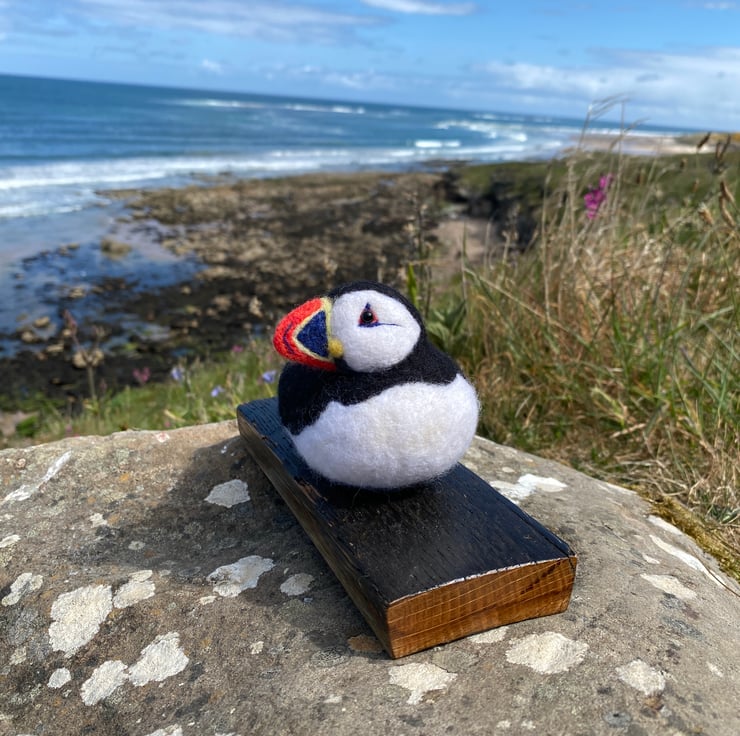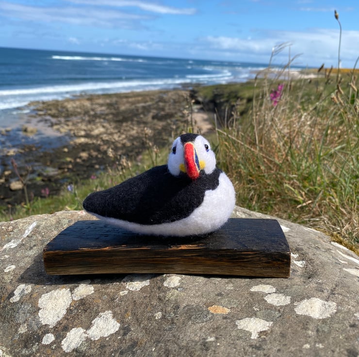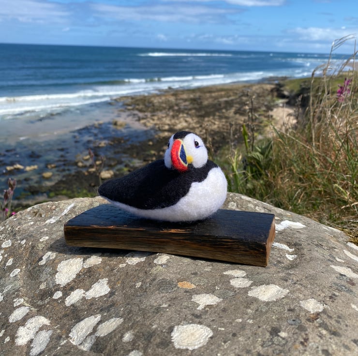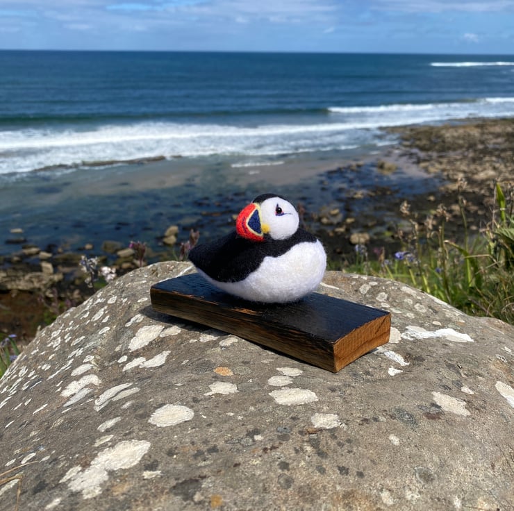 This delightful Puffin has been made from soft wool, hand felted over the course of several weeks! Using a single felting needle, the wool fibres have been brought together to sculpt and colour all his amazing details.