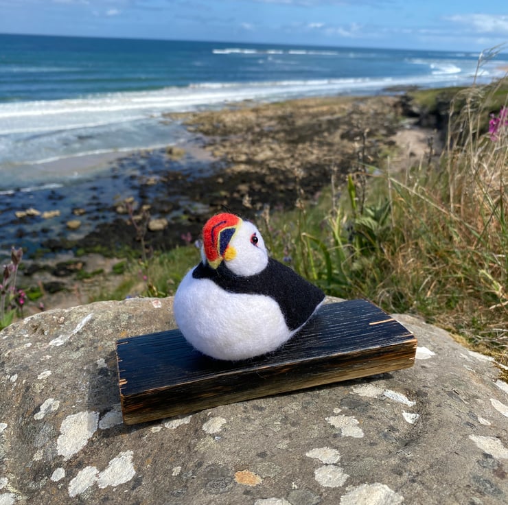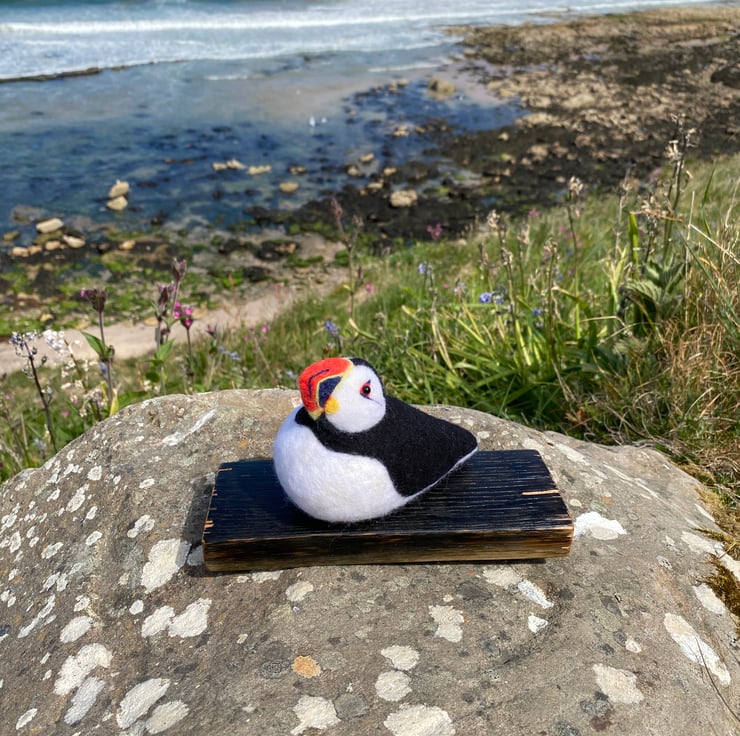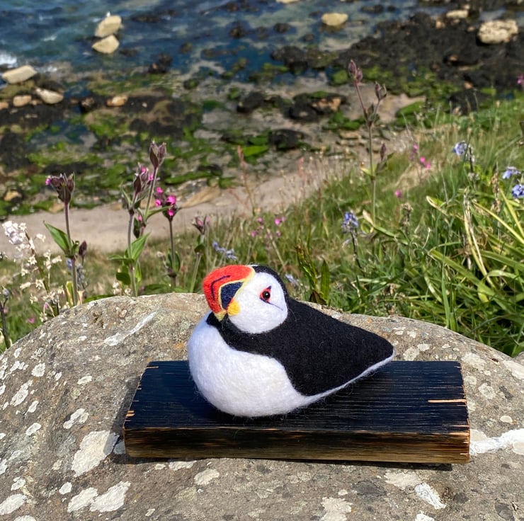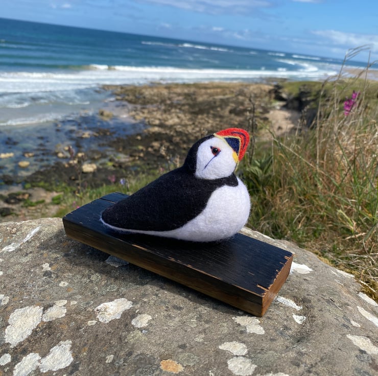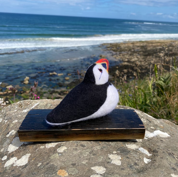 This delightful Puffin has been made from soft wool, hand felted over the course of several weeks! Using a single felting needle, the wool fibres have been brought together to sculpt and colour all her amazing details.