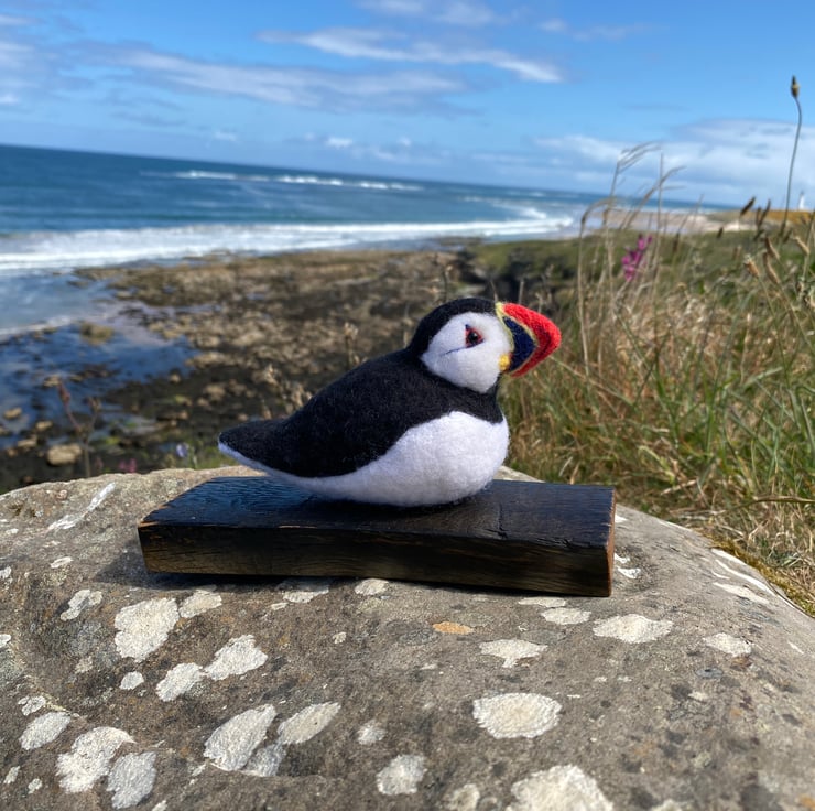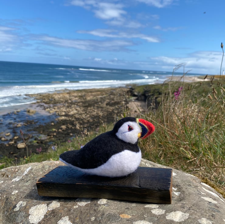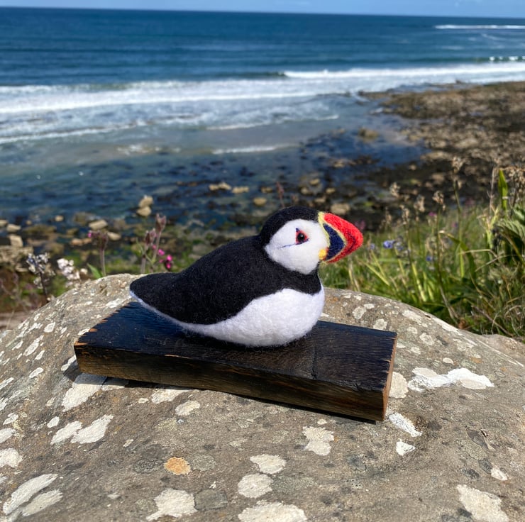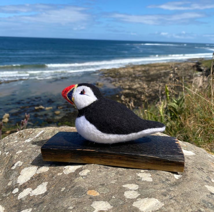 This delightful Puffin has been made from soft wool, hand felted over the course of several weeks! Using a single felting needle, the wool fibres have been brought together to sculpt and colour all her amazing details.