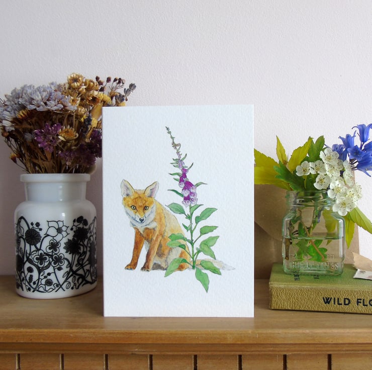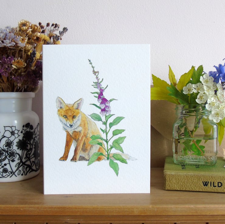 My watercolour painting of a handsome fox sitting among the foxglove flowers printed onto tintoretto gesso card stock for a luxurious feel.
