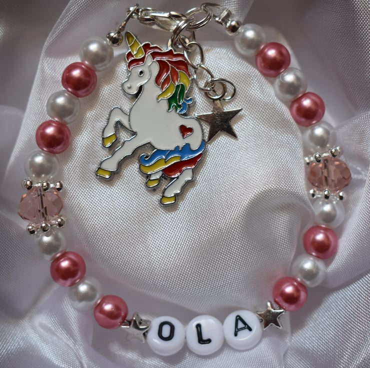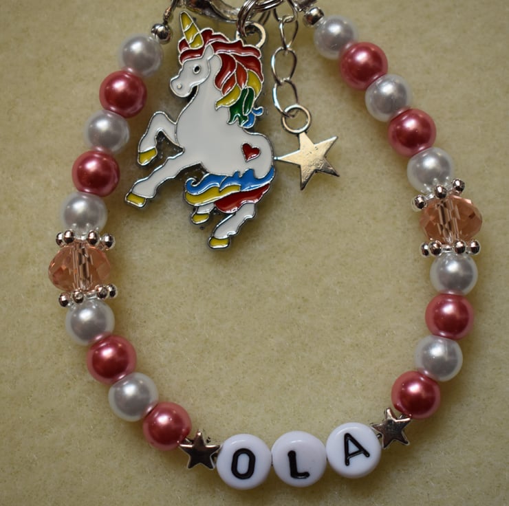 Made with 6mm glass pearl beads, pink crystal beads, silver plated snowflake spacer beads and findings. White acrylic letter beads. Enamel multi-coloured unicorn pendant and small silver plated star pendant.