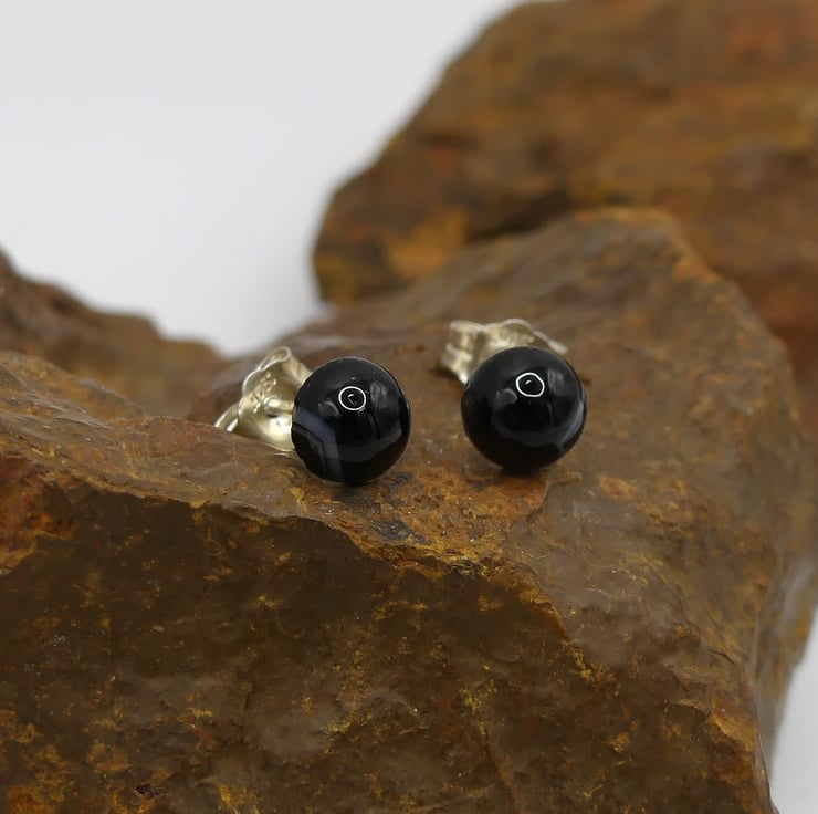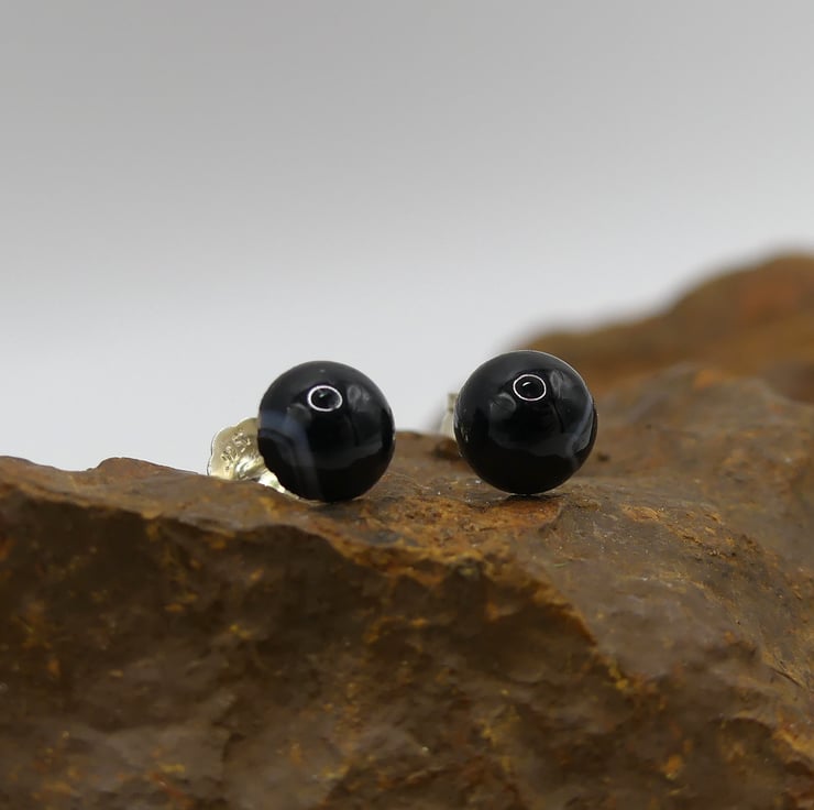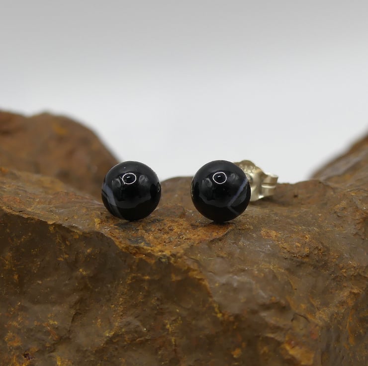 Black Banded Agate 6mm Gemstones, Sterling Silver Earrings. Side White Bands.